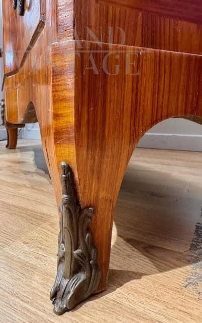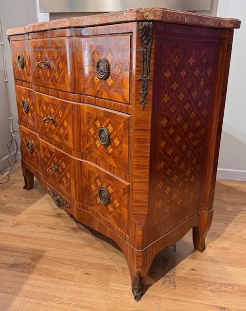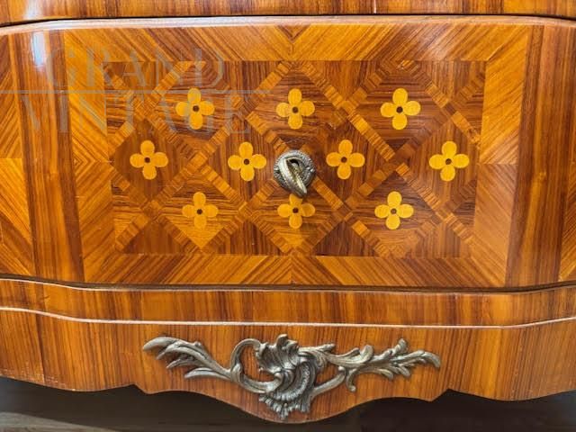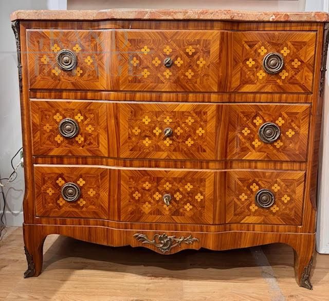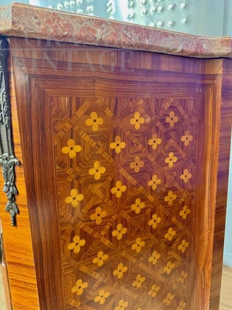 Elegante comò cassettone antico settecentesco italiano in varie essenze arricchito da intarsi a quadrifoglio. Il cassettone presenta un fronte a tre cassetti sagomati, piedi leggermente sciabolati e coperchio in marmo breccia. Maniglie e guarniture sono in fusione di bronzo. Il cassettone risulta in ottimo stato di conservazione e originale in ogni sua parte.
