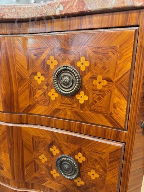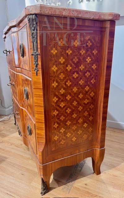 Comò cassettone del Settecento con ricchi intarsi e piano in marmo