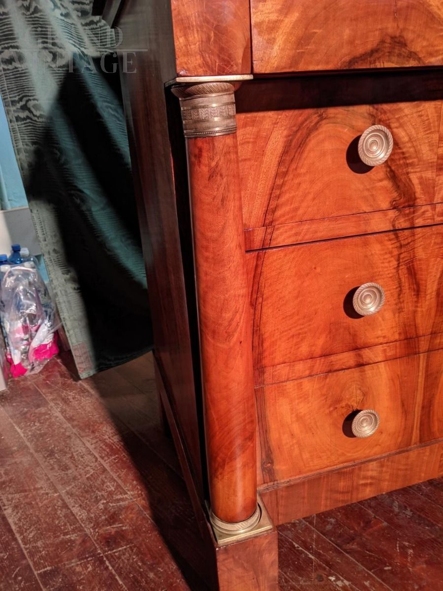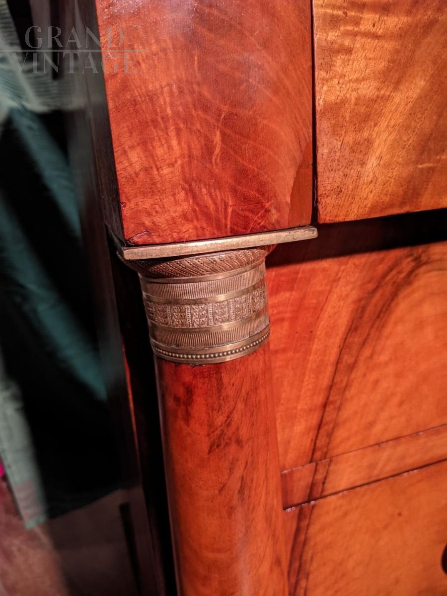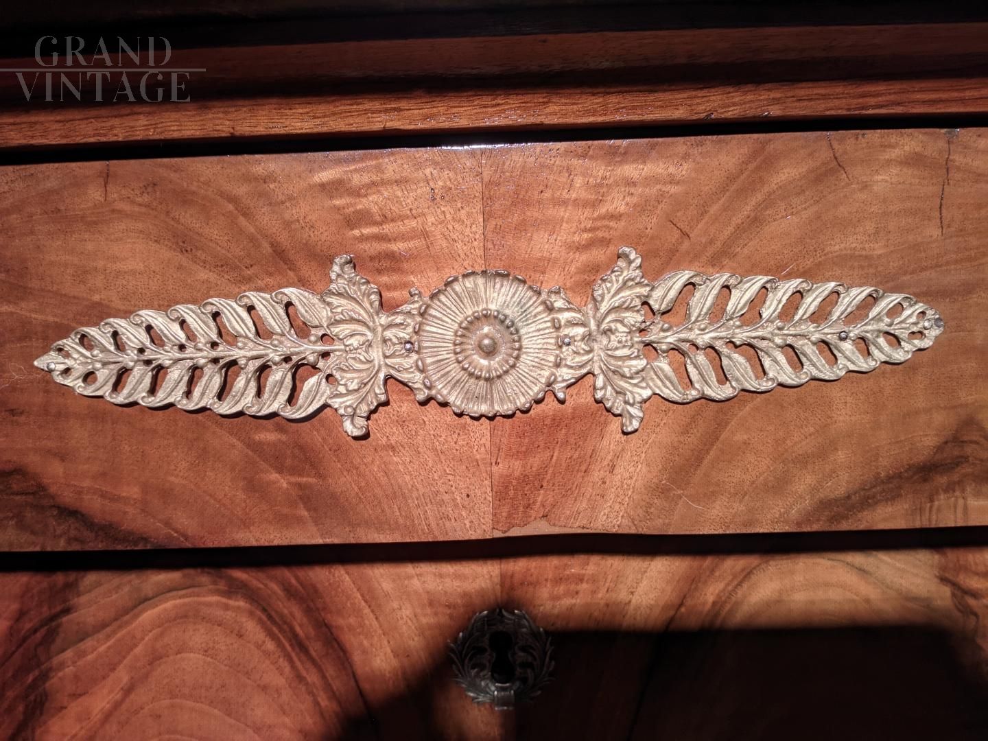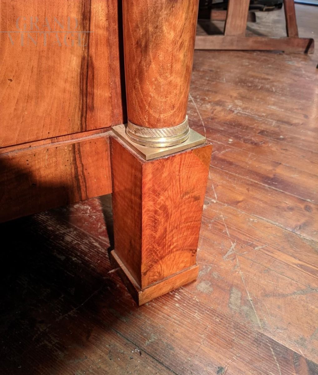 Cassettone Impero in noce massello e lastronato in piuma di noce con fodere interne in noce. Piano in marmo nero del Belgio, impreziosito da bellissimi bronzi finemente cesellati, chiave d'epoca. Il mobile è di provenienza francese ed è databile nei primi anni del XIX secolo.
