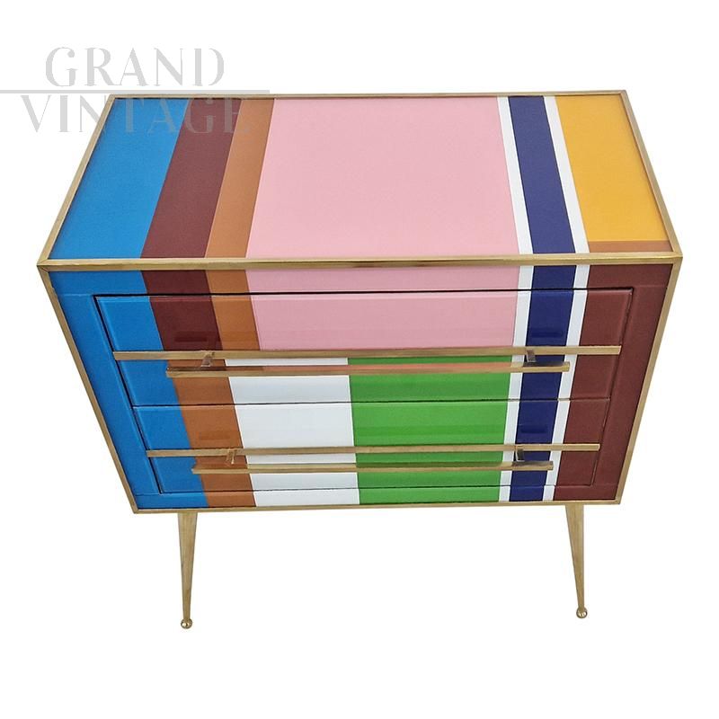 Comò design con due cassetti interamente realizzato a mano, con struttura in legno rivestita in tessere di vetro di Murano multicolore. Profili, maniglie e piedi in ottone dorato.