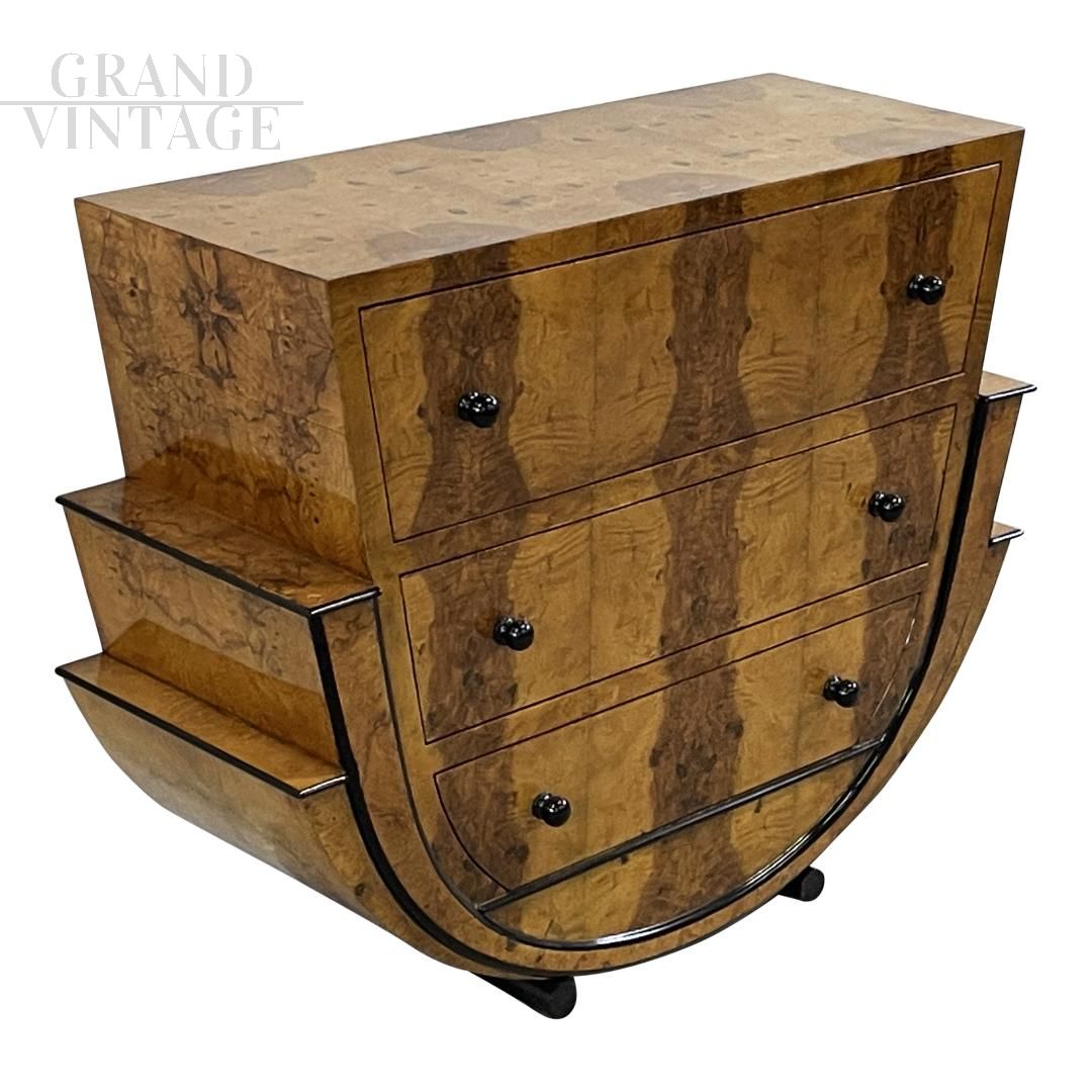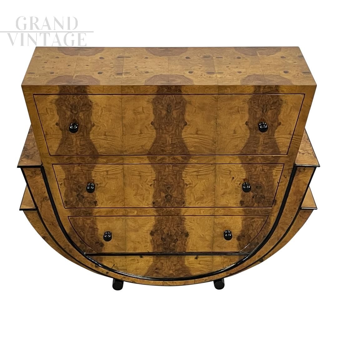 Elegante comò di linea Art Déco a tre cassetti in radica di noce con una caratteristica forma stondata; bordi, pomoli e piedi laccati neri.