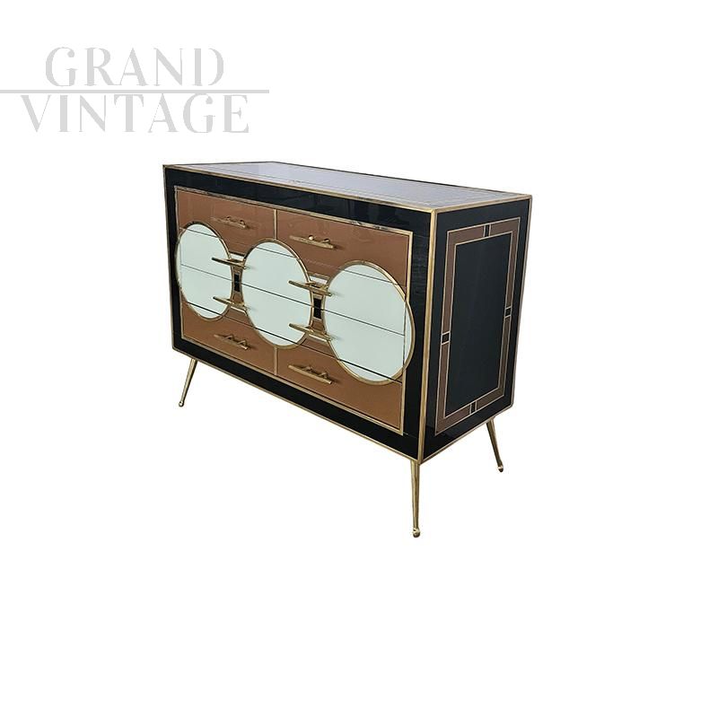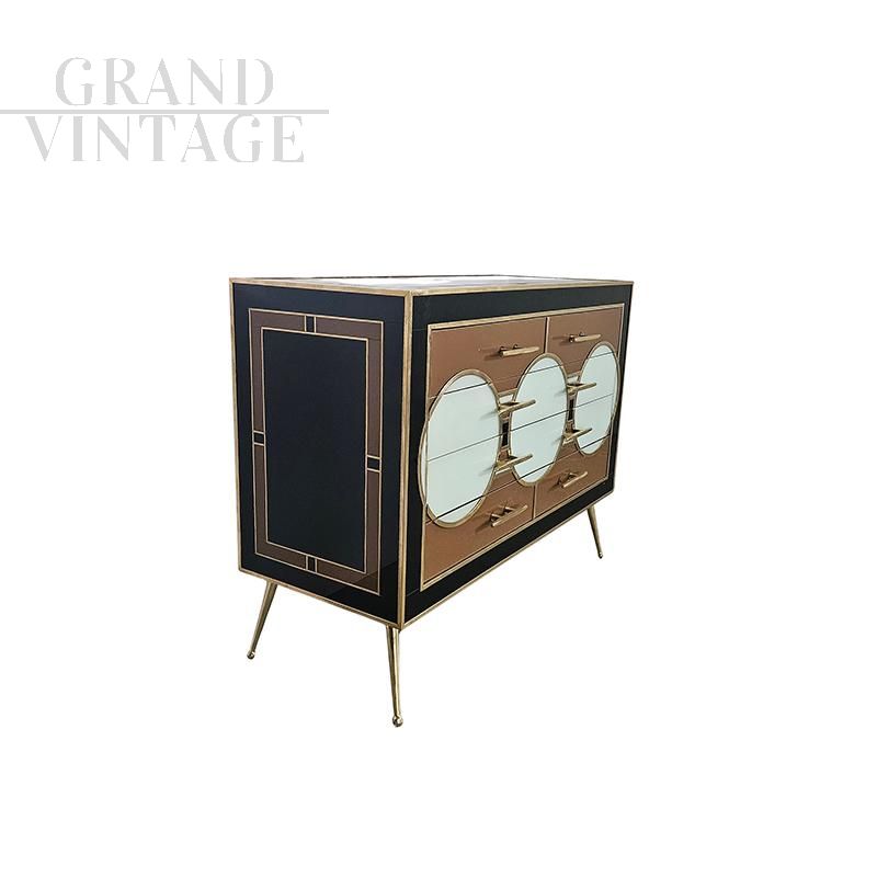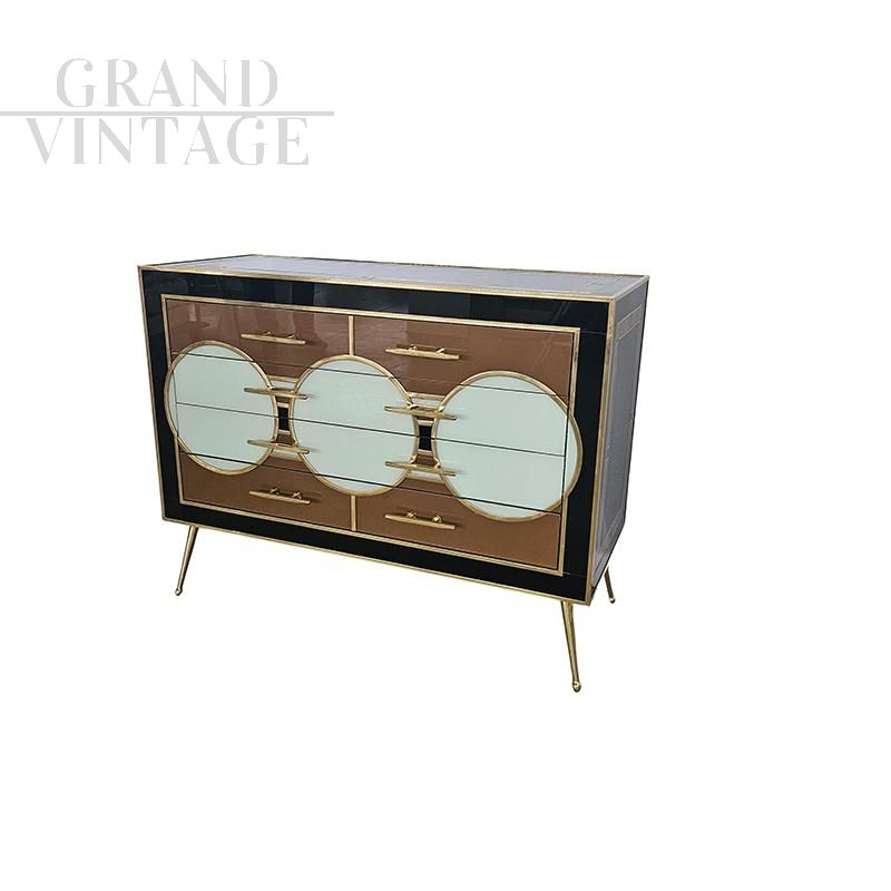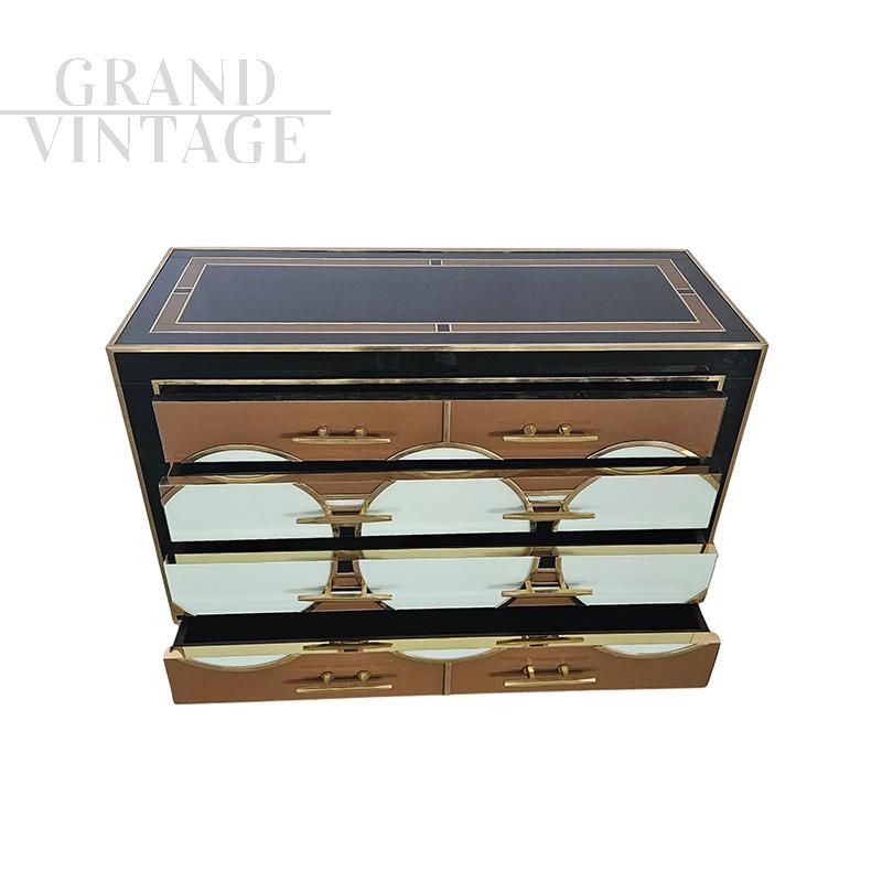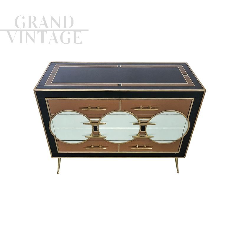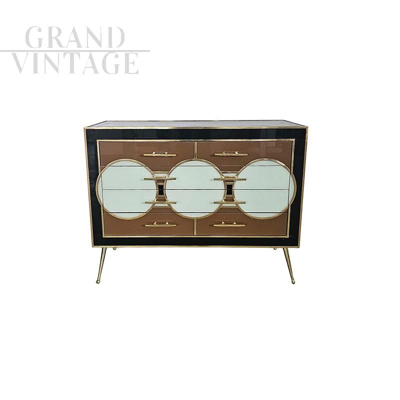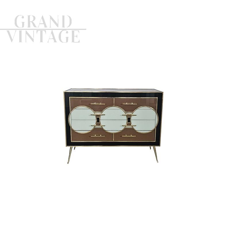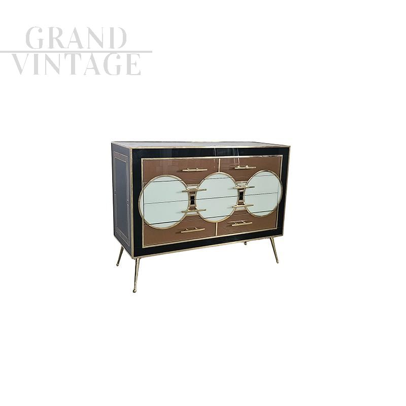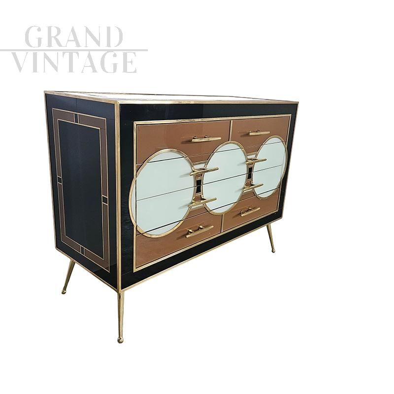 Comò a 4 cassetti interamente realizzato a mano, con struttura in legno ricoperto in vetro nero e marrone, arricchito da disegni rotondi in vetro bianco e giochi geometrici di colore nero e marrone sui fianchi e sul piano. Profili, maniglie e piedi in ottone dorato.