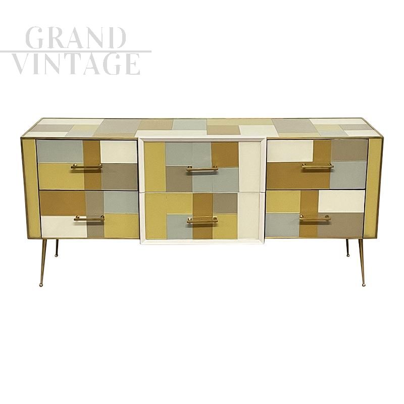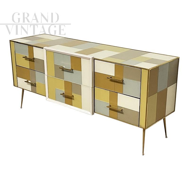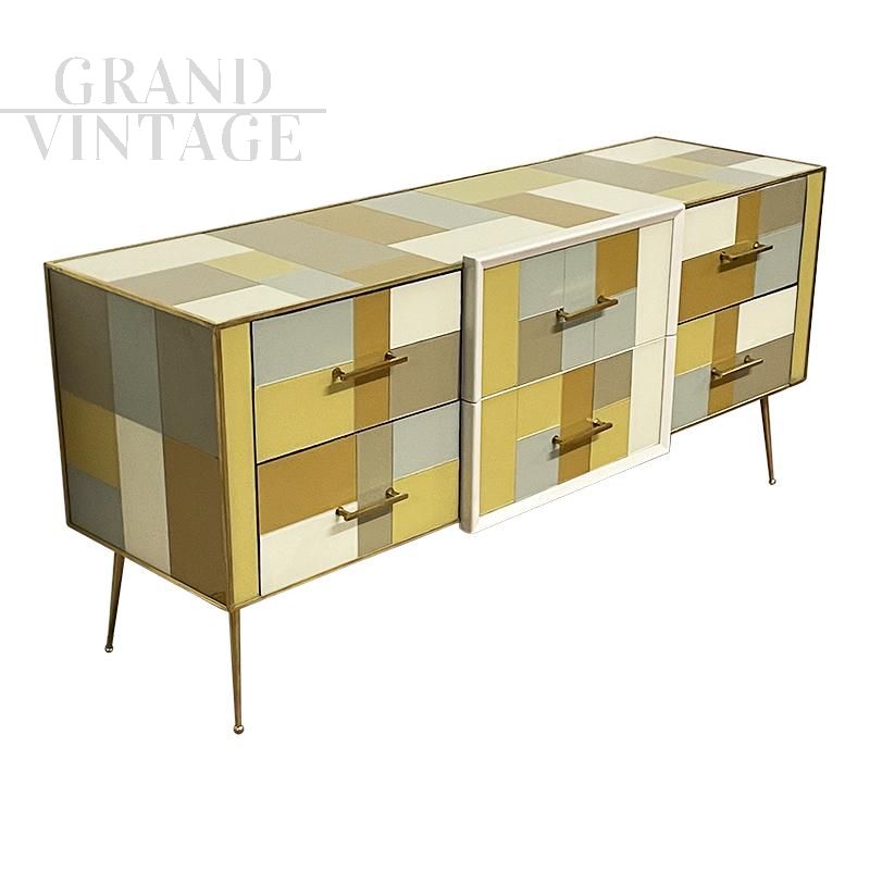 Grande comò basso design a sei cassetti interamente realizzato a mano, con struttura in legno ricoperta in vetro nei colori senape, giallo, grigio; profili, finiture, maniglie e piedi in ottone dorato, rilievo anteriore in legno bianco, dotata di ripiano interno.