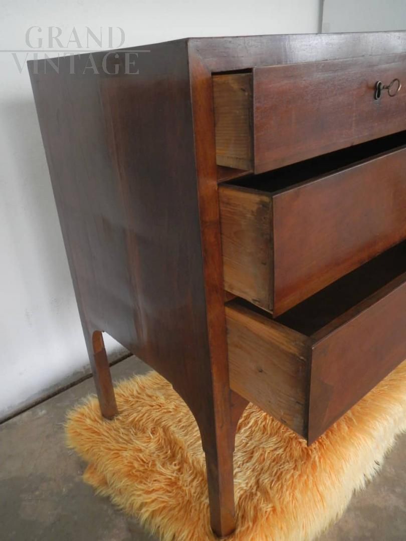 Elegante comò Impero Italiano di fine '800 in legno di noce nazionale, restaurato delle parti mancanti e lucidato a stoppino. Le serrature, le chiavi e le bocchette sono originali. Parte posteriore in legno di abete in patina e interno dei casetti in stato originale.