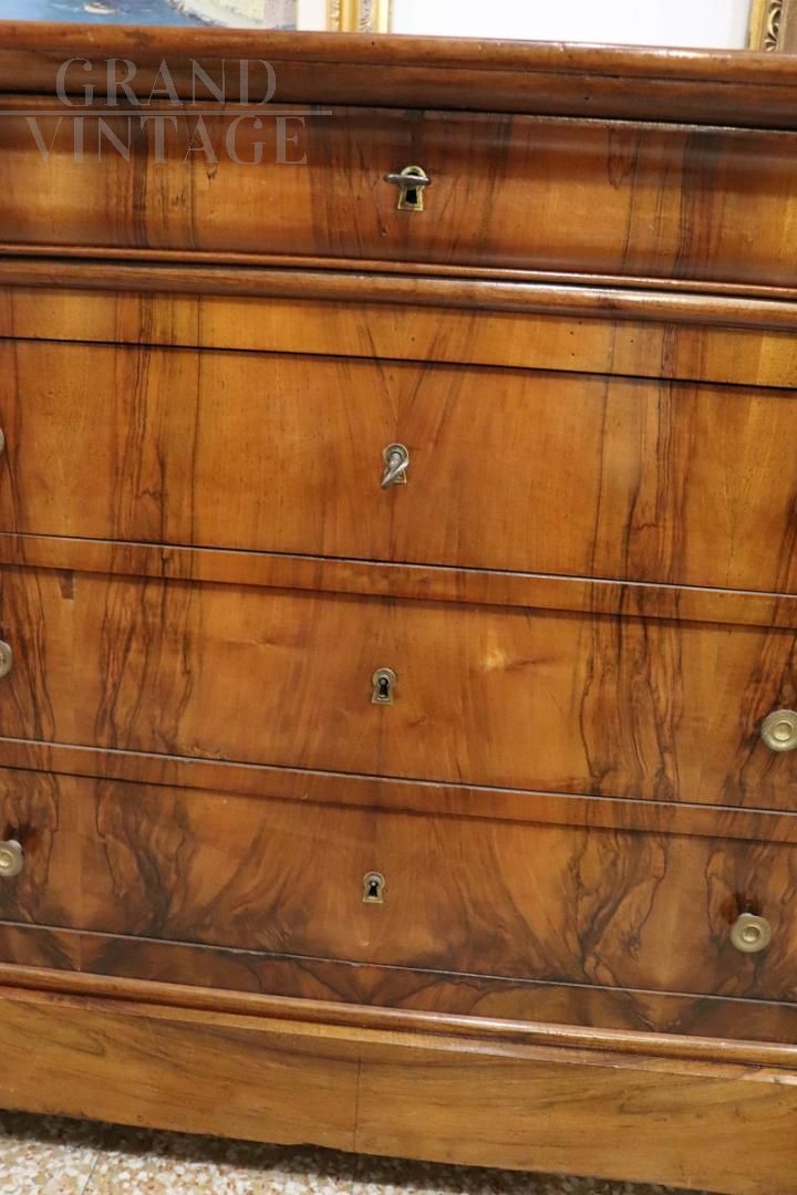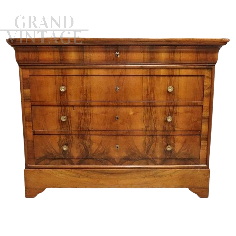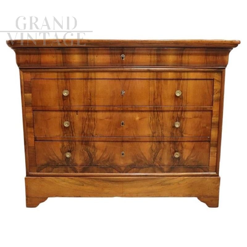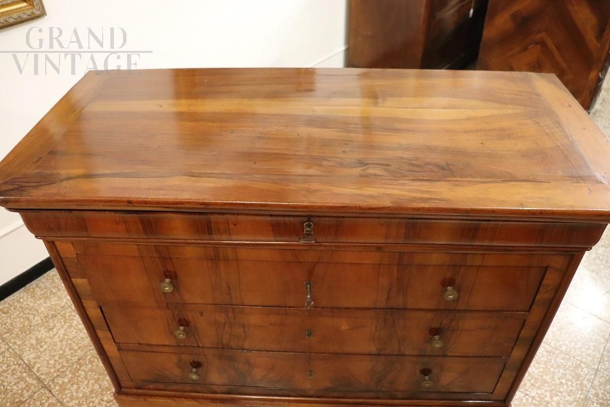 Realizzato in noce, offre una struttura robusta e durevole, completata da una finitura chiara che mette in risalto le splendide venature del legno, creando un'estetica calda e invitante adatta sia agli interni classici che a quelli contemporanei. Originario del periodo Luigi Filippo, presenta un design raffinato e semplice che si armonizza con vari stili di arredamento. Il restauro professionale, eseguito con un approccio conservativo, mantiene il fascino autentico della cassapanca e i segni naturali dell'età, esaltandone il carattere storico. La finitura accentua le belle venature del noce, aggiungendo un fascino visivo distintivo. La funzionalità è fondamentale, con tre cassetti spaziosi e un cassetto superiore più piccolo, che offrono un ampio spazio di archiviazione. Prezzo trattabile