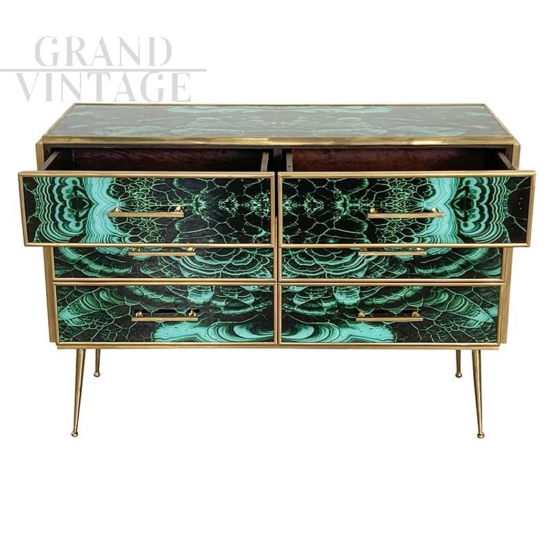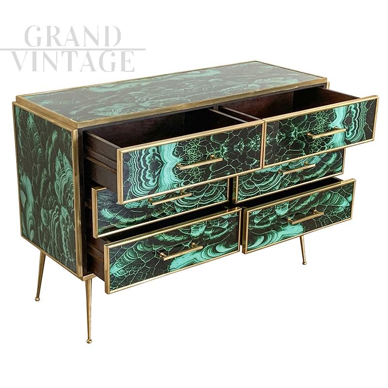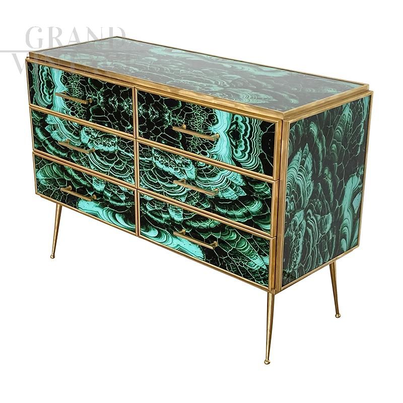 Comò in legno rivestito in vetro dalle sfumature verdi e nere effetto malachite, con profili maniglie e piedini in ottone, dotato di sei cassetti.