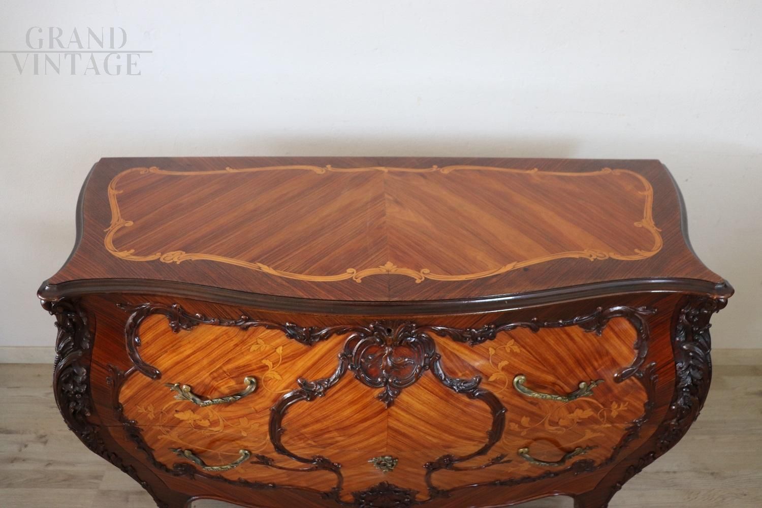 Elegante e importante comò in stile antico Luigi XV databile intorno ai primi decenni del secolo XX, pregevole riproduzione d'epoca in legno di palissandro. Il comò è caratterizzato dalla tipica forma bombata con decorazioni sia ad intaglio che ad intarsio. Dotato di due ampi cassetti. In perfette condizioni, pronto per essere collocato nella vostra casa.