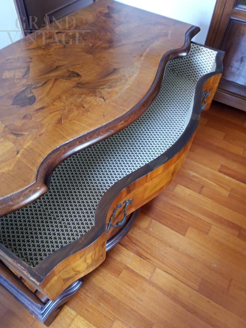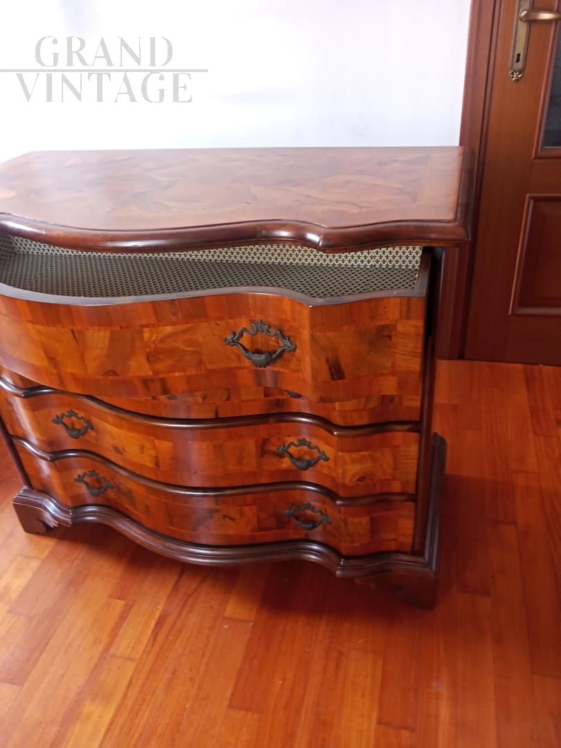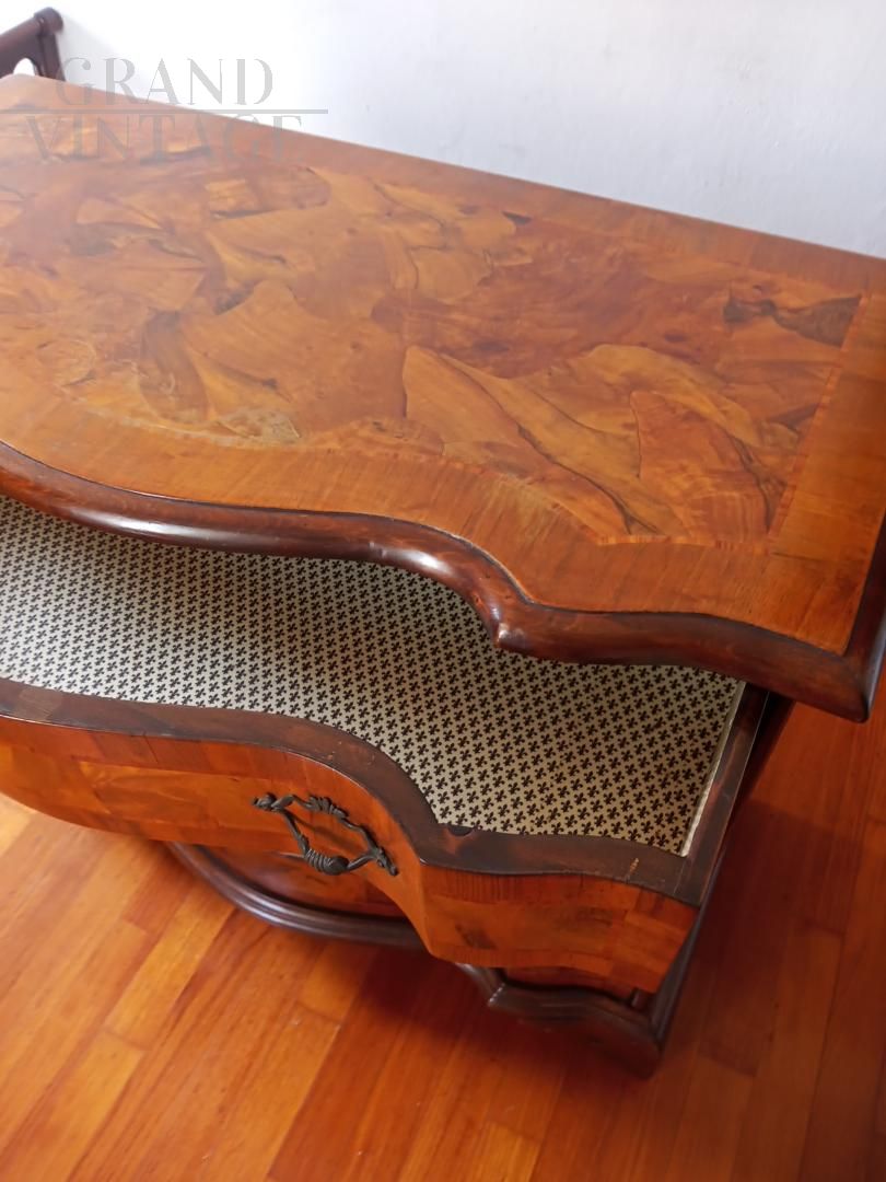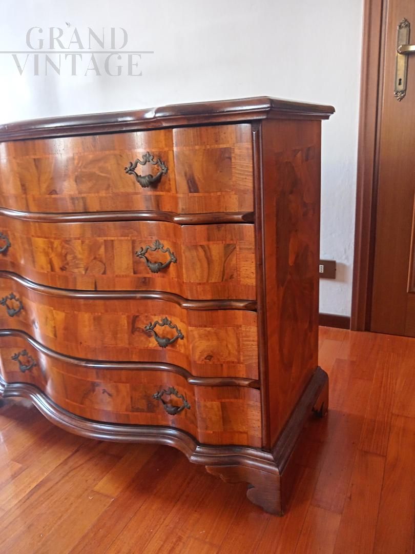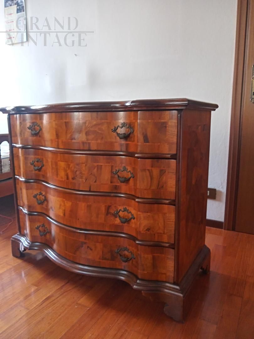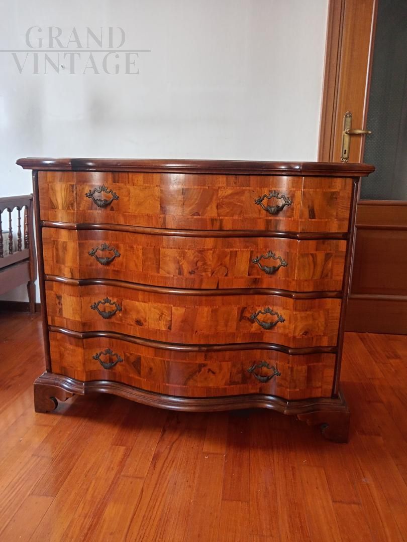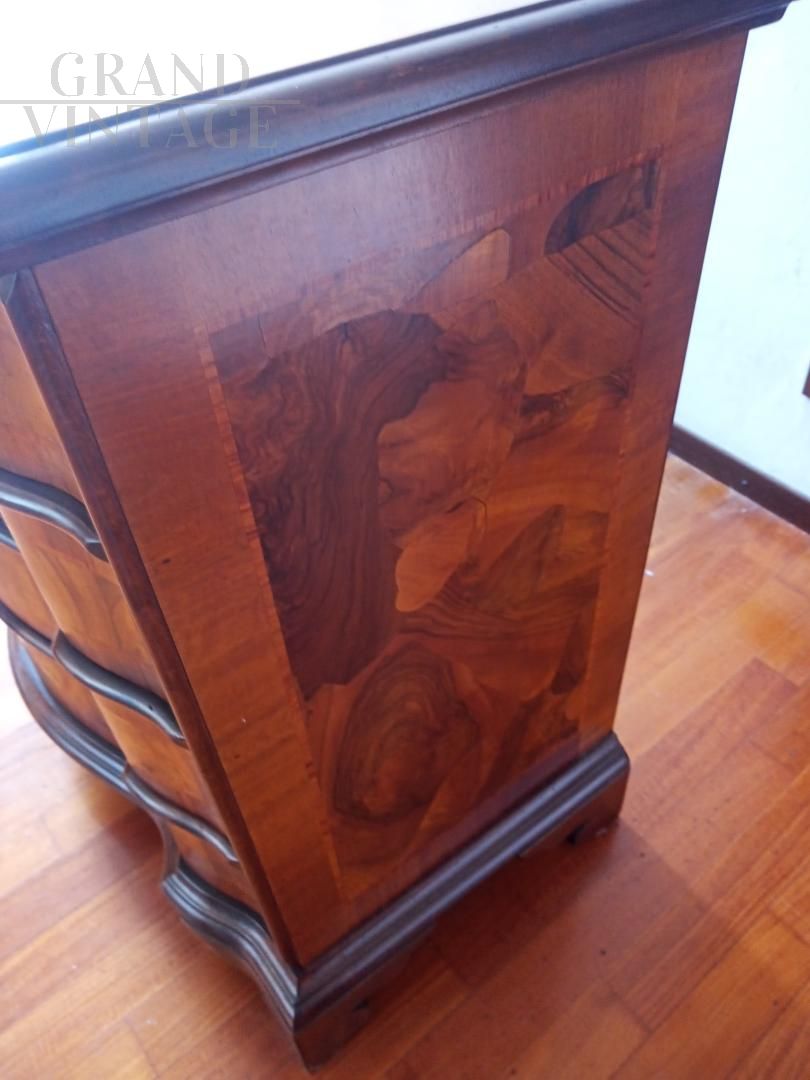 Comò in stile barocco antico in radica di noce dotato di quattro cassetti molto capienti dalla elegante forma mossa, provenienza Italia di metà '900, la lavorazione artigianale e l'eleganza delle rifiniture rendono questo comò perfetto per arredare con classe un ingresso o un angolo di arredo sia moderno che in stile. In perfette condizioni non necessita di nessun intervento o restauro.