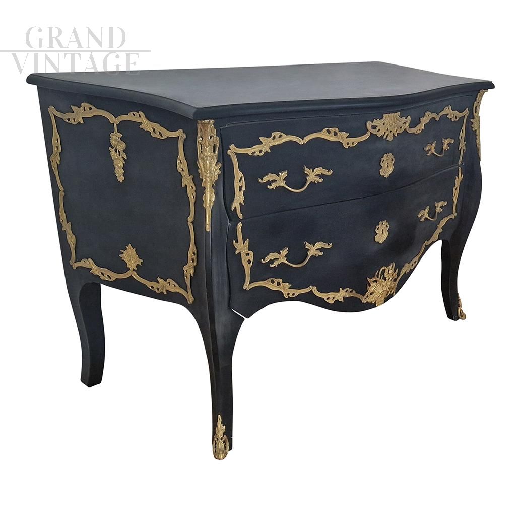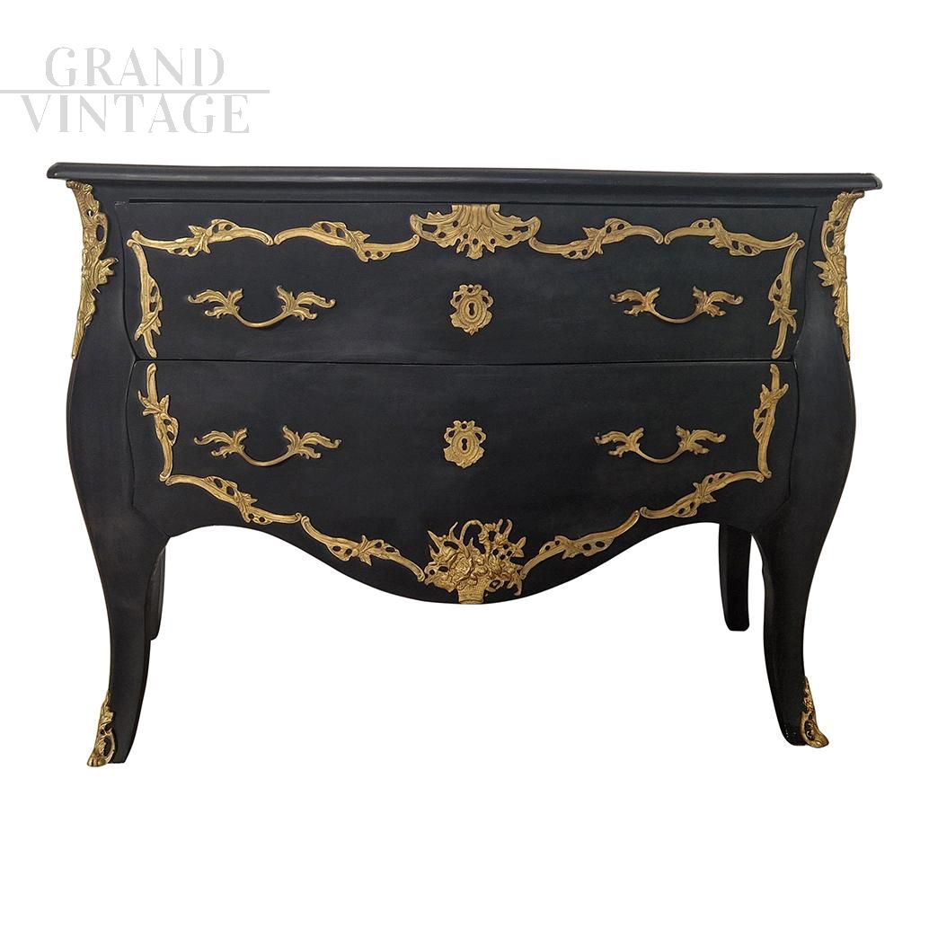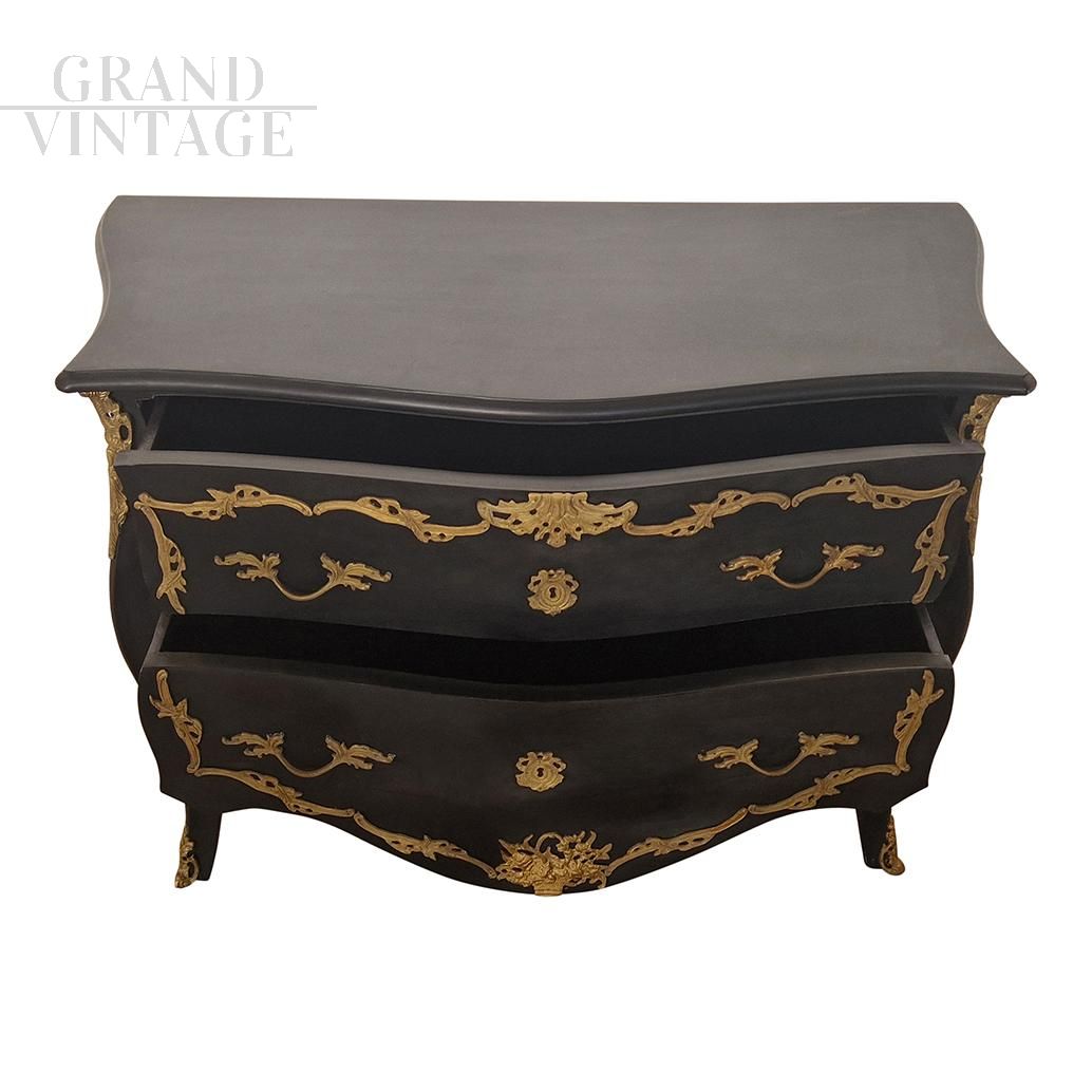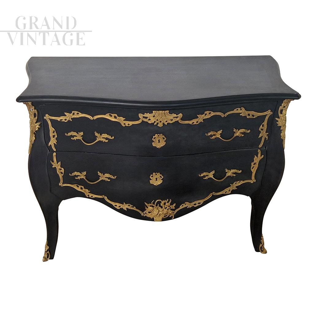 Comò in stile barocco in legno nero con decorazioni in bronzo dorato