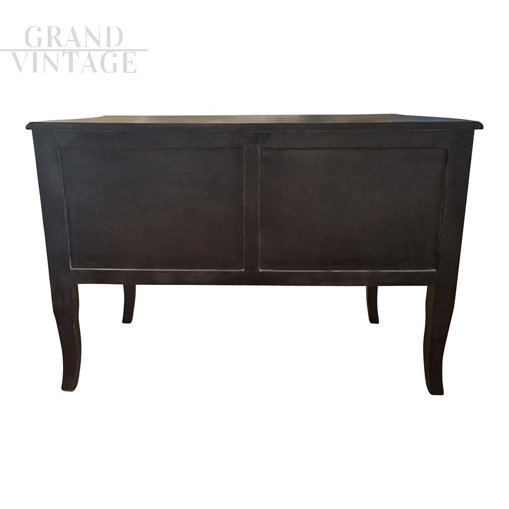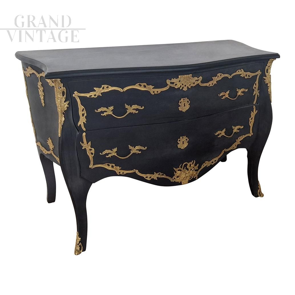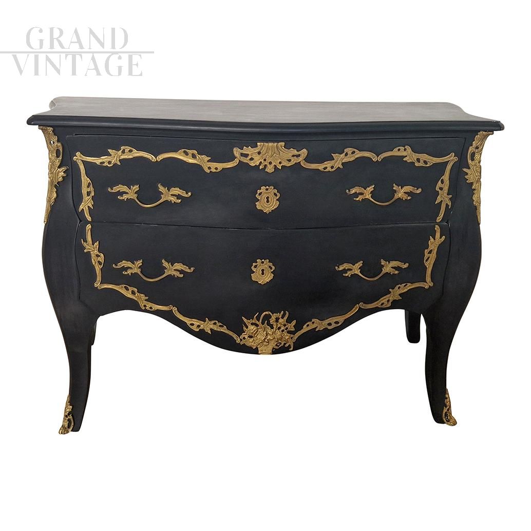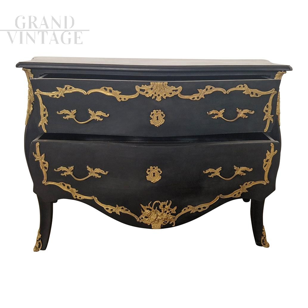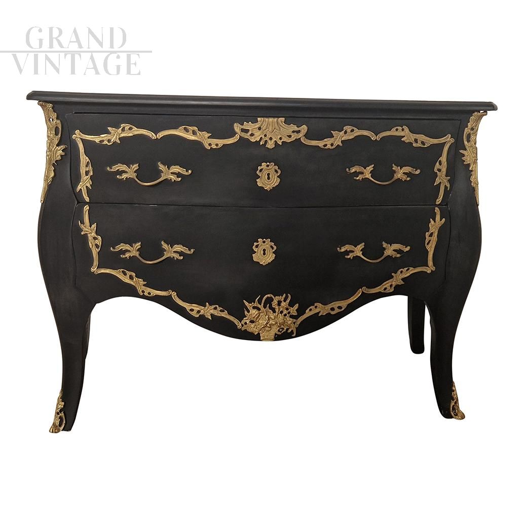 Comò in stile barocco in legno nero con decorazioni in bronzo dorato