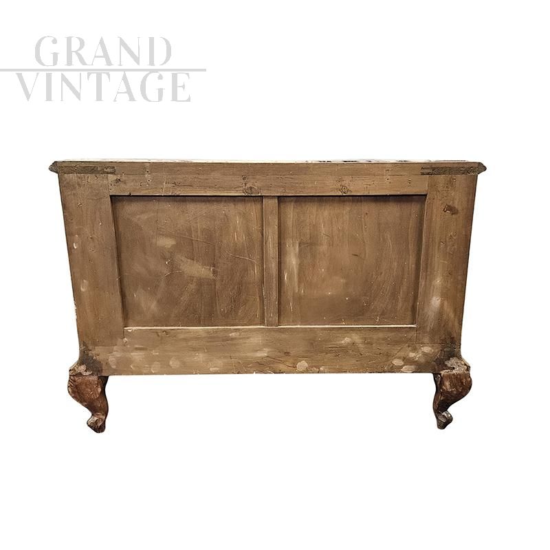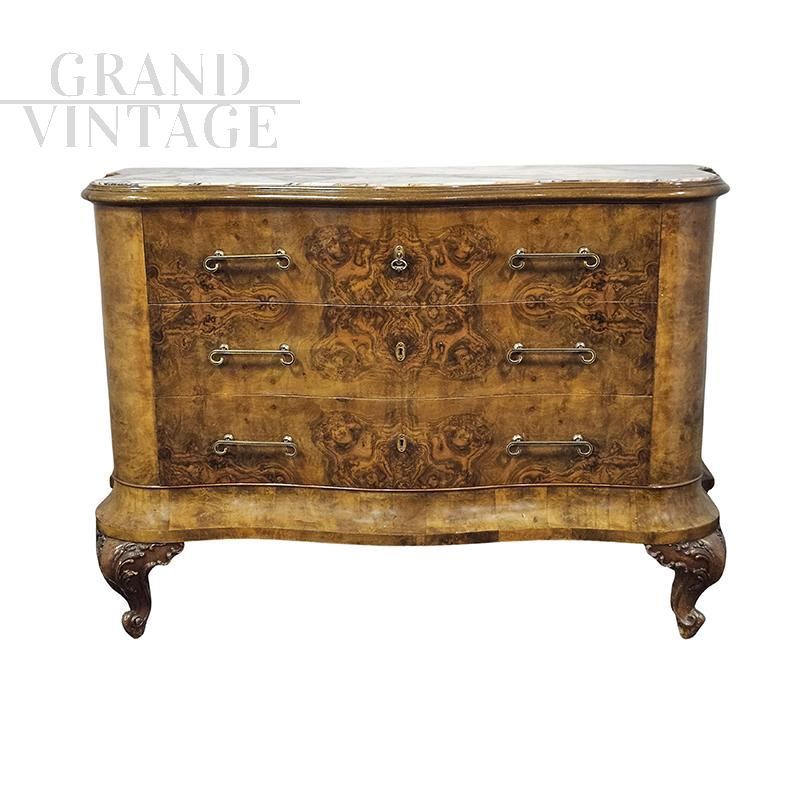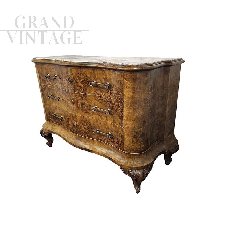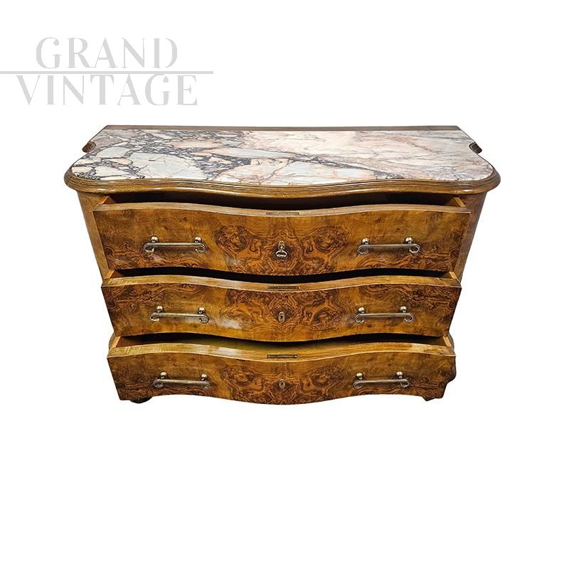 Comò in stile chippendale in radica di noce e noce con piano in marmo maculato, dotato di tre cassetti completi di maniglie in bronzo e chiavi.