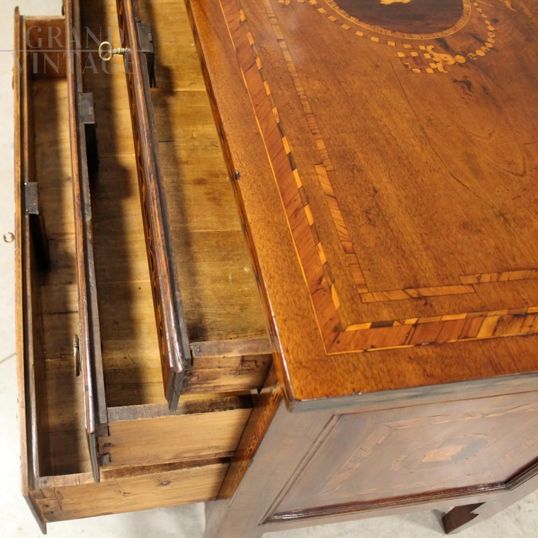 Comò Luigi XVI lombardo in noce intarsiato, Italia '700