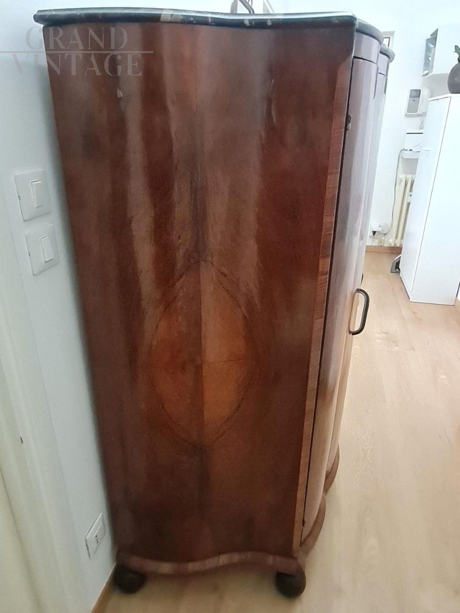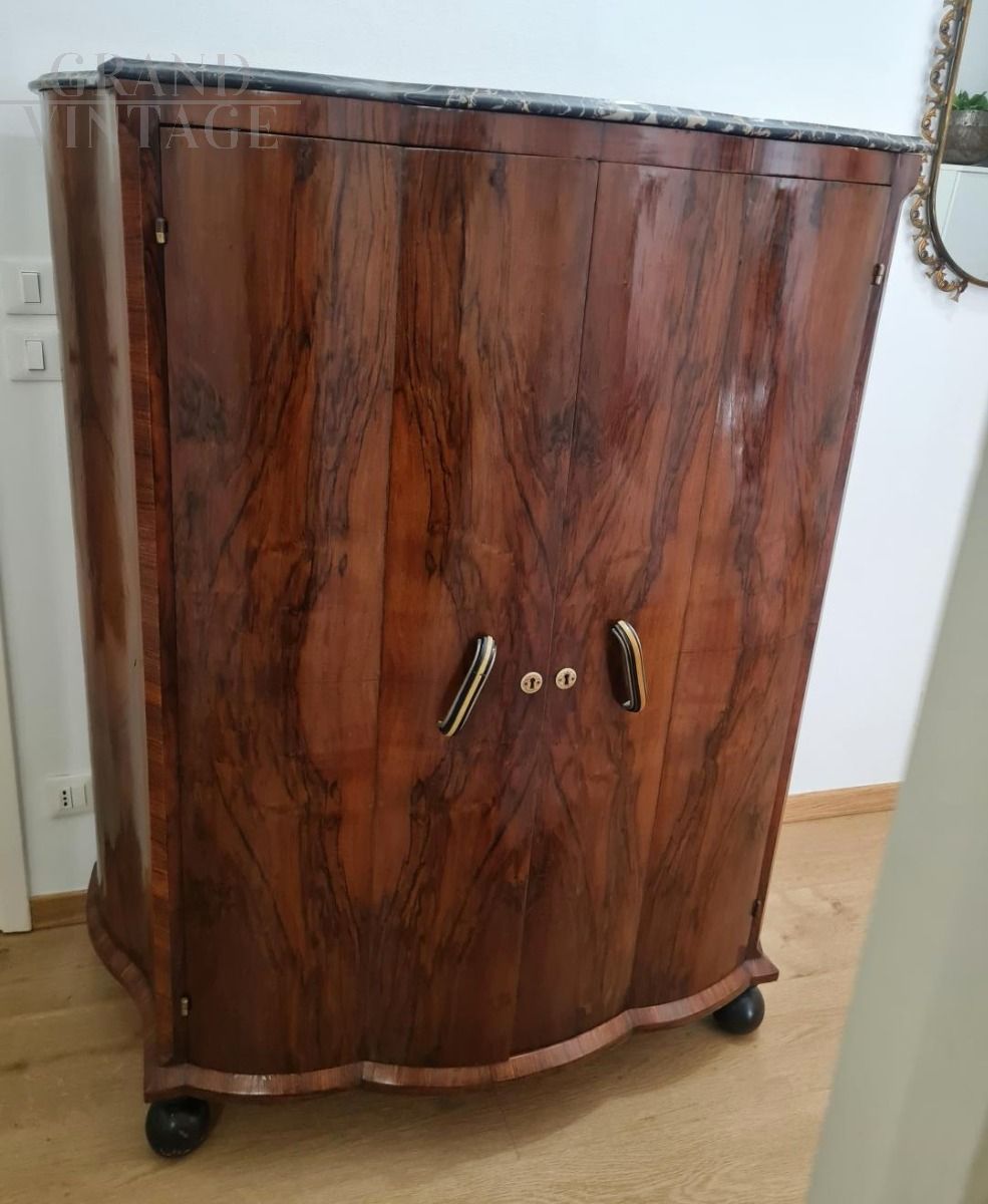 Splendido secretaire art déco con due ante che celano una cassettiera interna, realizzato negli anni '40 in noce e radica, unico nelle sue forme mosse con piedi a cipolla, maniglie originali e piano in marmo nero con venature fantastiche.