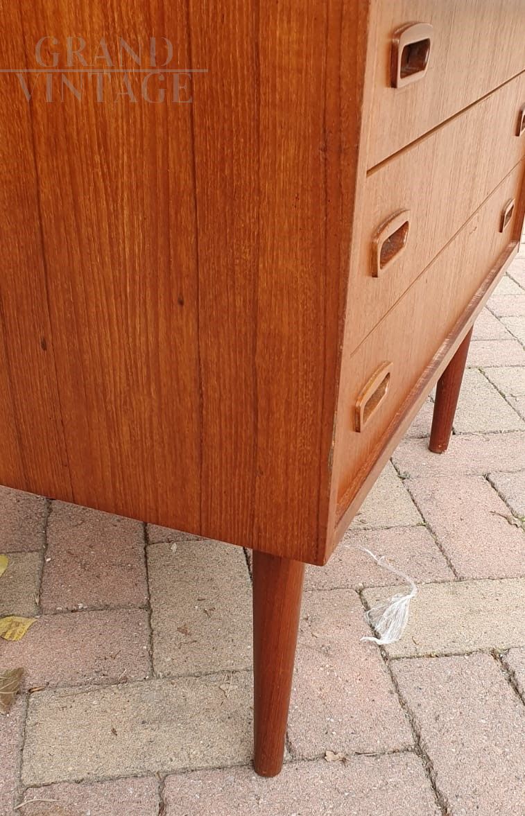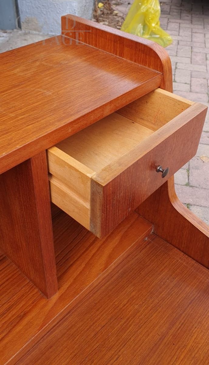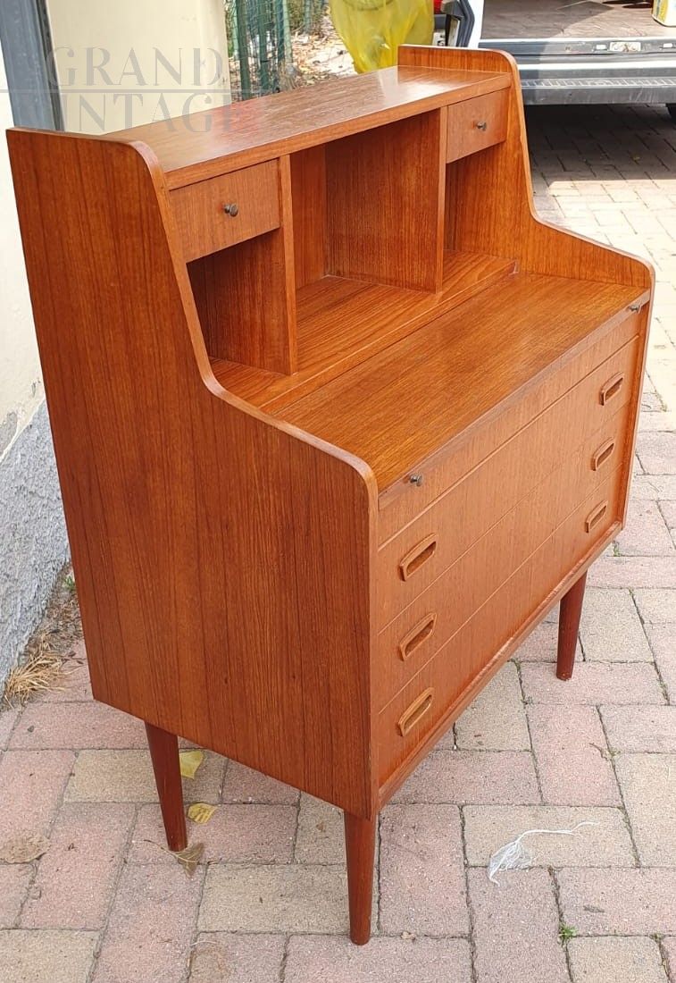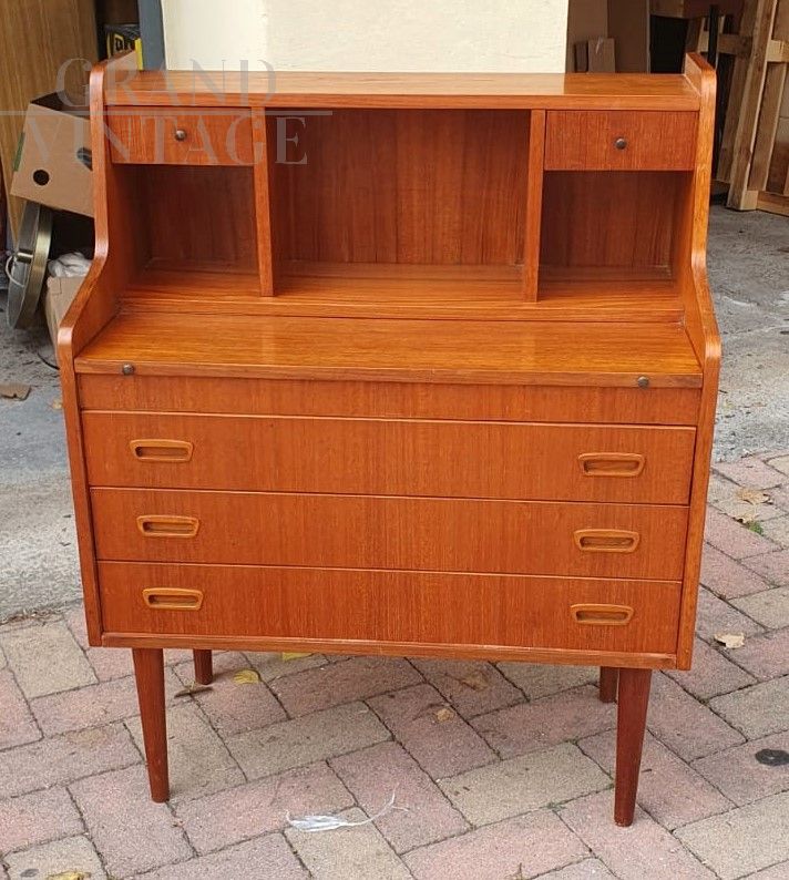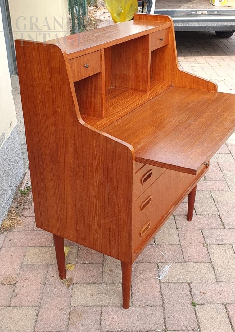 Secretaire scandinavo vintage anni '60 in legno teak di piccole dimensioni, composto da una cassettiera con 3 cassetti, un piano estraibile e alcuni vani e cassettini posizionati sul piano. Molto particolare il dettaglio delle maniglie. Perfetto da posizionare sia in camera da letto sia in salotto. In ottime condizioni, restaurato, presenta piccoli naturali segni del tempo.