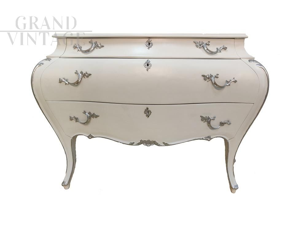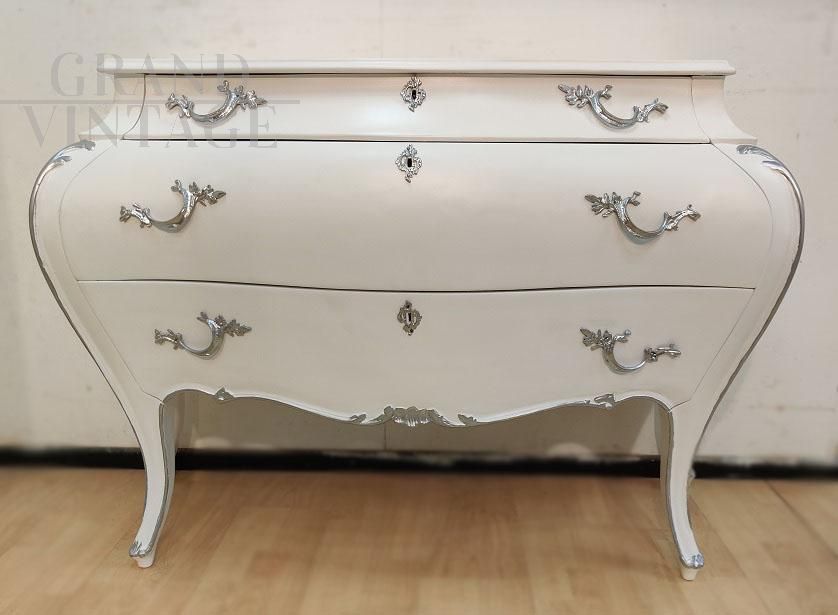Comò in stile Barocco '700 veneziano laccato bianco con intagli e decori argentati, bombato sui frontali e laterali con pianale sagomato e piedi a ricciolo. Il comò è una riproduzione del periodo Barocco, costruito nella seconda metà del '900, è in legno di tiglio con 3 cassetti bombati e curvati, interno dei cassetti e schienali in legno massello di abete. Sagomato con intagli decorativi sulla profilatura del mobile evidenziata dalla decoratura. Mobile originale riproduzione realizzata seconda metà del 900, restaurato e in ottimo stato conservativo, con finiture laccate di colore bianco opaco con intagli a decoro argento. Maniglie e bocchette originali con finitura argentata.