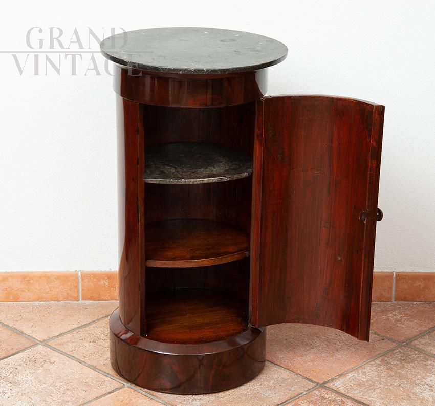 Comodino a cilindro Impero francese in piuma di mogano con piano in marmo nero del Belgio. Il piano in marmo poggia su un fusto cilindrico con al centro una porta che si apre tramite un pomello in legno. Internamente vi sono due mensole, di cui una in legno e l'altra in marmo, che dividono lo spazio in tre parti. Questo tipo di oggetto viene spesso utilizzato come mobiletto portabottiglie.