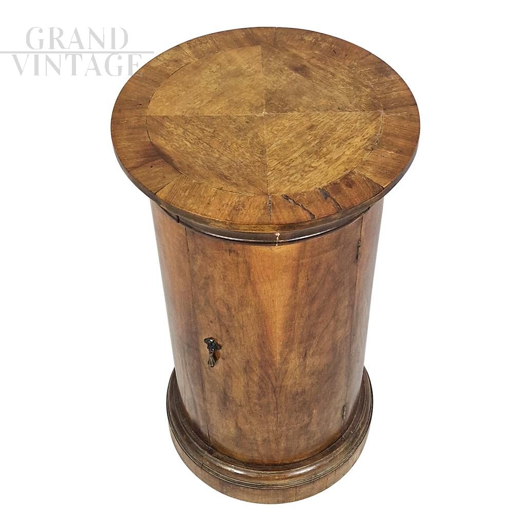 Comodino antico a colonna o a cilindro in legno, con un'antina a celare un ripiano centrale e un cassetto sotto il piano. Disponibili 3 pezzi.