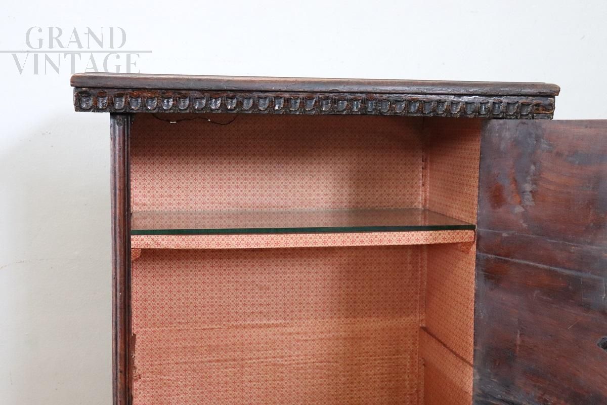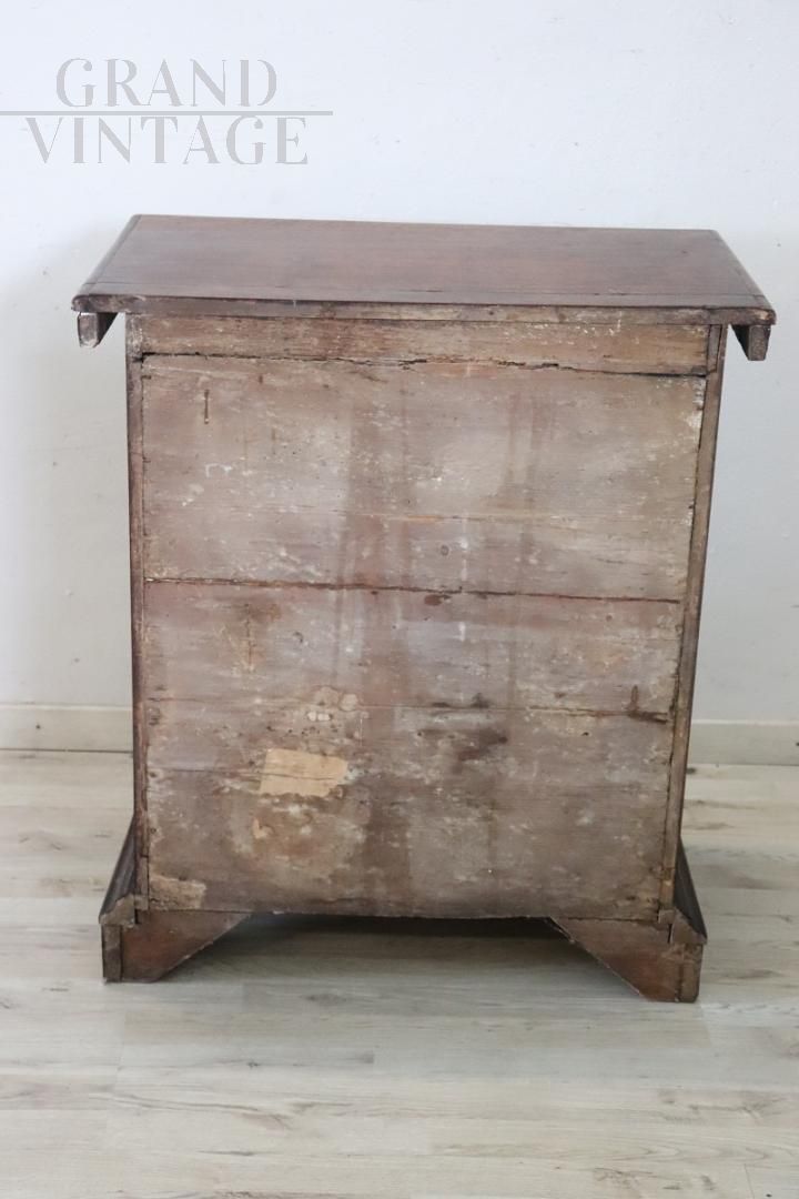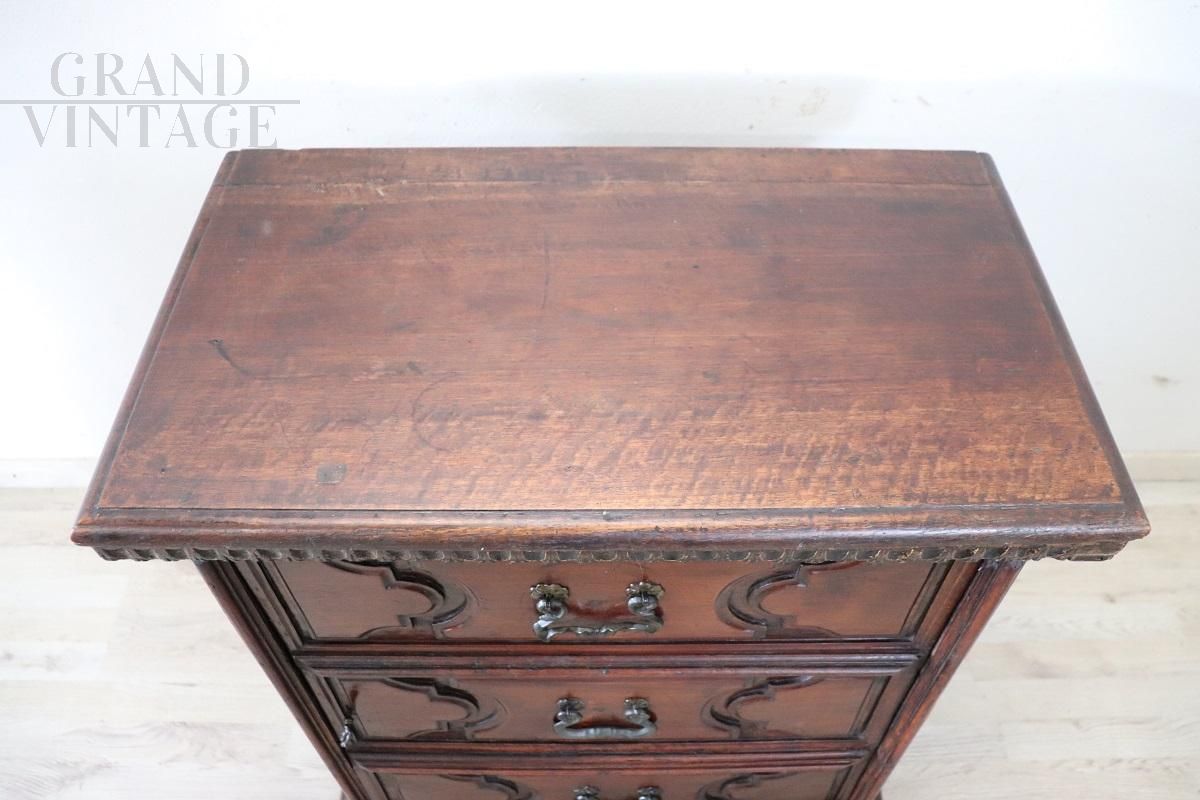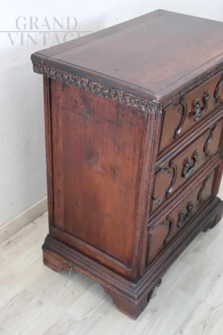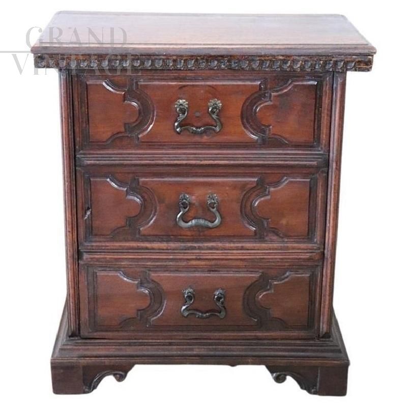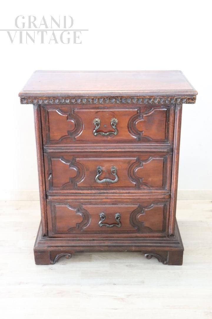 Raro e prezioso comodino italiano antico risalente ai primi decenni del XVIII secolo, realizzato in legno di noce massello e caratterizzato da un fronte con pannelli decorativi. La sua linea di design è tipica dei mobili della regione toscana. Può sembrare dotato di cassetti, ma si tratta di un effetto illusorio perché ha un'anta e un pratico vano interno con un ripiano. Si noti che in origine probabilmente aveva dei cassetti che per praticità sono stati trasformati in un'anta nel corso dei secoli. Spettacolari le maniglie pendenti sul fronte in bronzo cesellato che hanno acquisito una bella patina antica. Possibili segni di usura nella carta di foderatura interna. Prezzo trattabile.