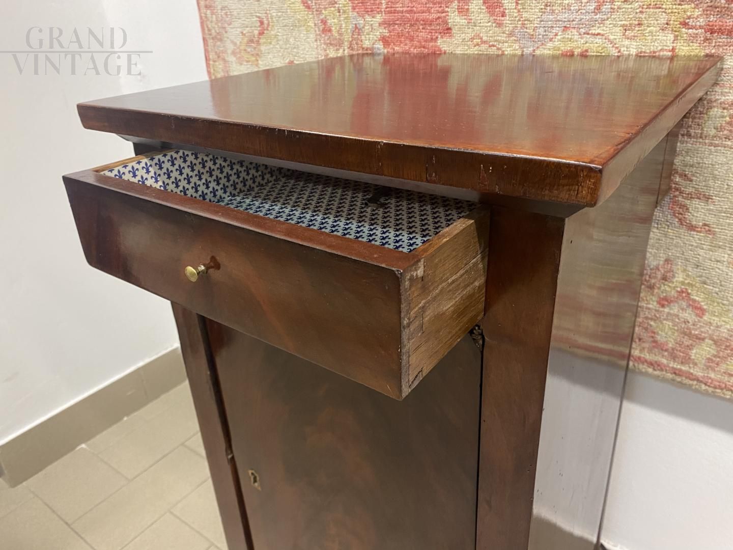 Raro comodino da centro antico di epoca Impero con colonne, cassetto e antina, completamente realizzato in piuma di mogano su tutti i lati, comprese le colonnine. Francia, XIX secolo. Comodino in ottime condizioni, serrature e chiavi originali dell’epoca. Particolarità: le rotelline per poter spostare senza sforzo questa sfiziosità di mobiletto.