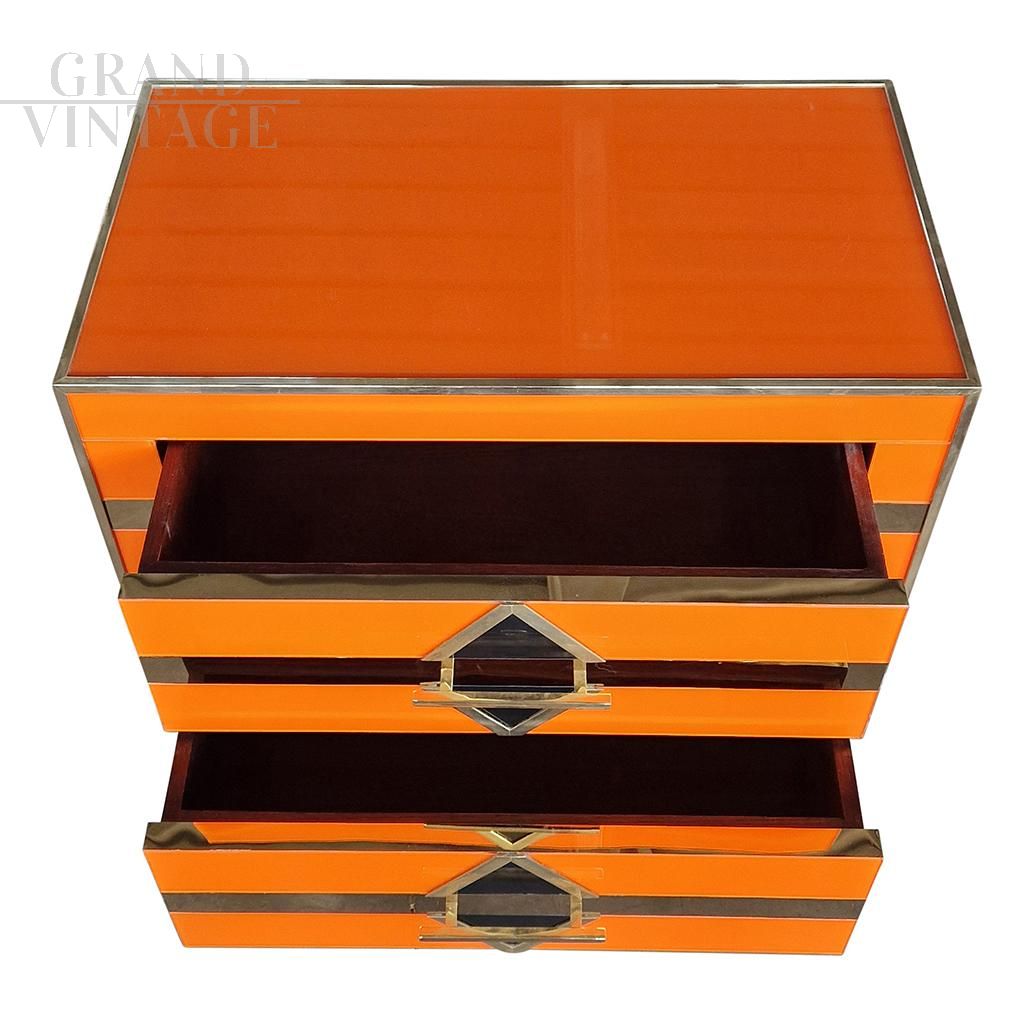 Comodino mobiletto in stile art déco in vetro arancione con geometrie