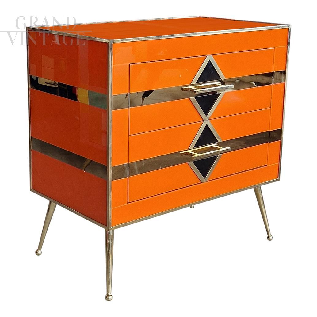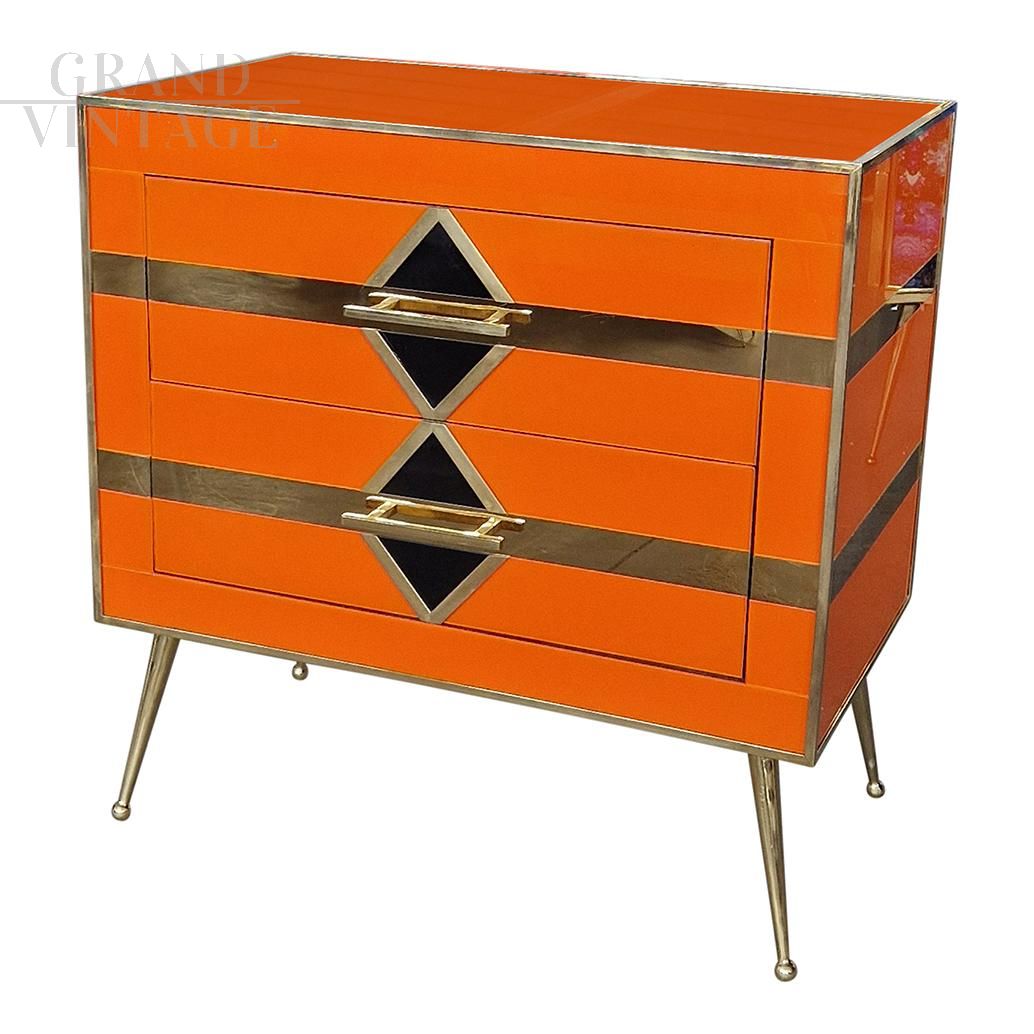 Comodino mobiletto con due cassetti in stile art déco interamente realizzato a mano, con struttura in legno rivestita in vetro color arancio con geometrie di rombi in vetro nero e linee dorate specchiate, profili maniglie e piedi in ottone dorato.