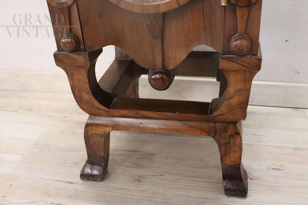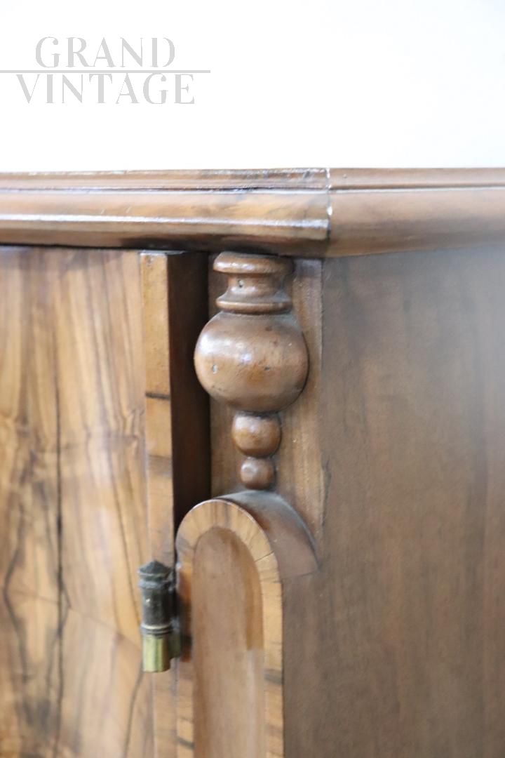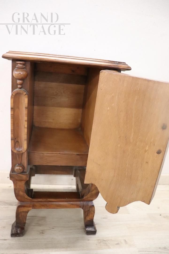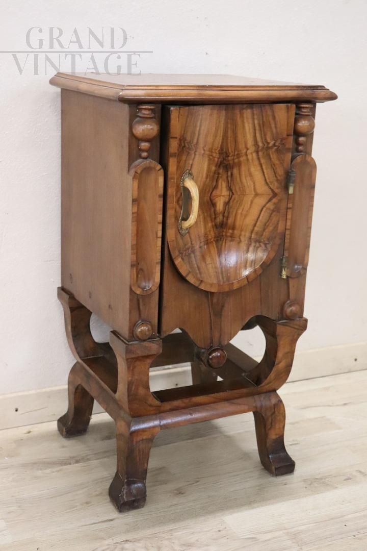 Particolare comodino realizzato in piena epoca Art Déco nei primi decenni del XX secolo in bellissima radica di noce, con decorazioni e intagli, dotato di un pratico vano. Il comodino è caratterizzato da una raffinata impiallacciatura in radica di noce che, con le sue venature accentuate, crea un effetto molto particolare. Grazie alle sue dimensioni ridotte, può essere utilizzato in diversi ambienti della casa, in camera da letto come comodino o in soggiorno come tavolino. Prezzo trattabile.
