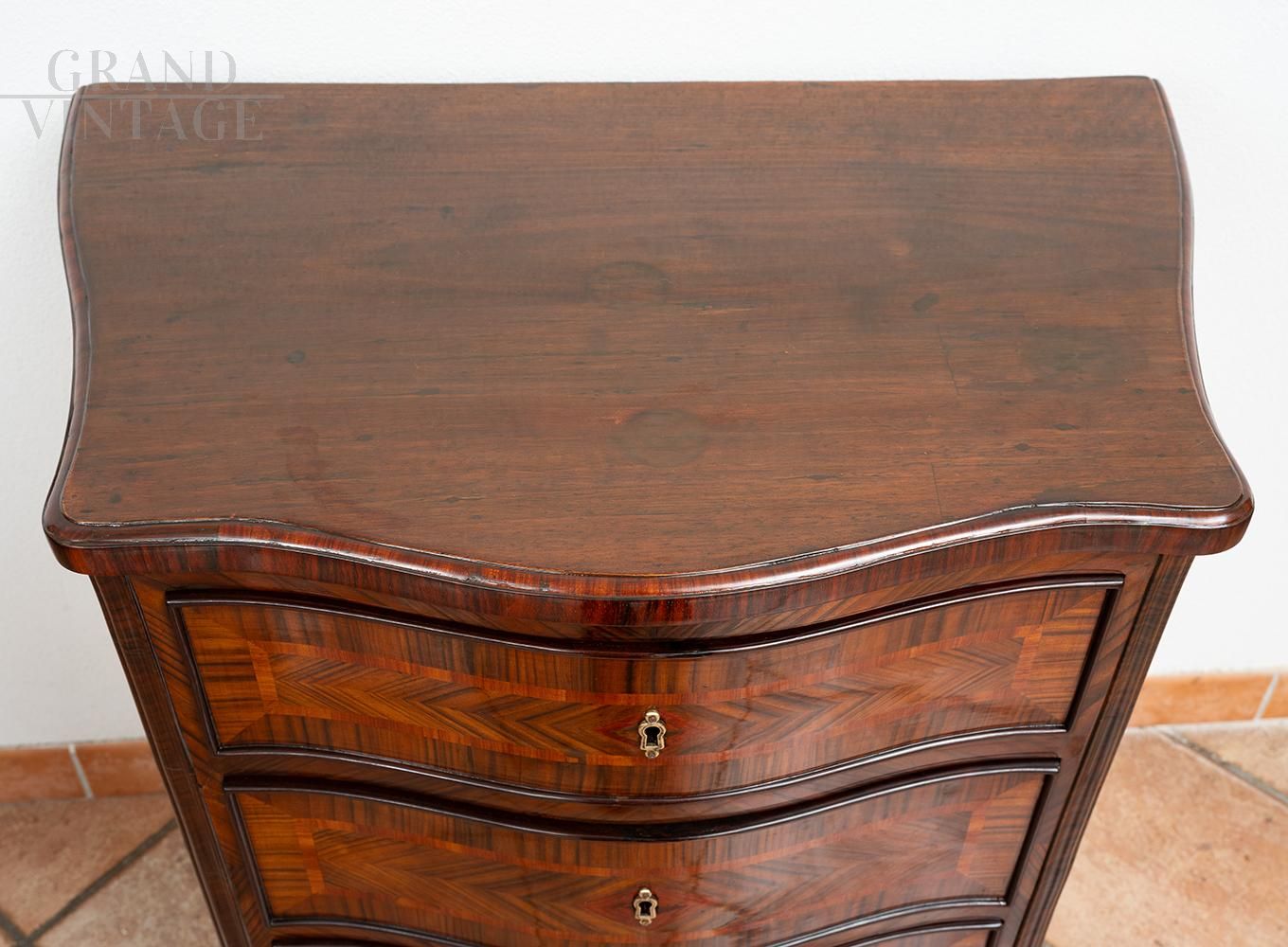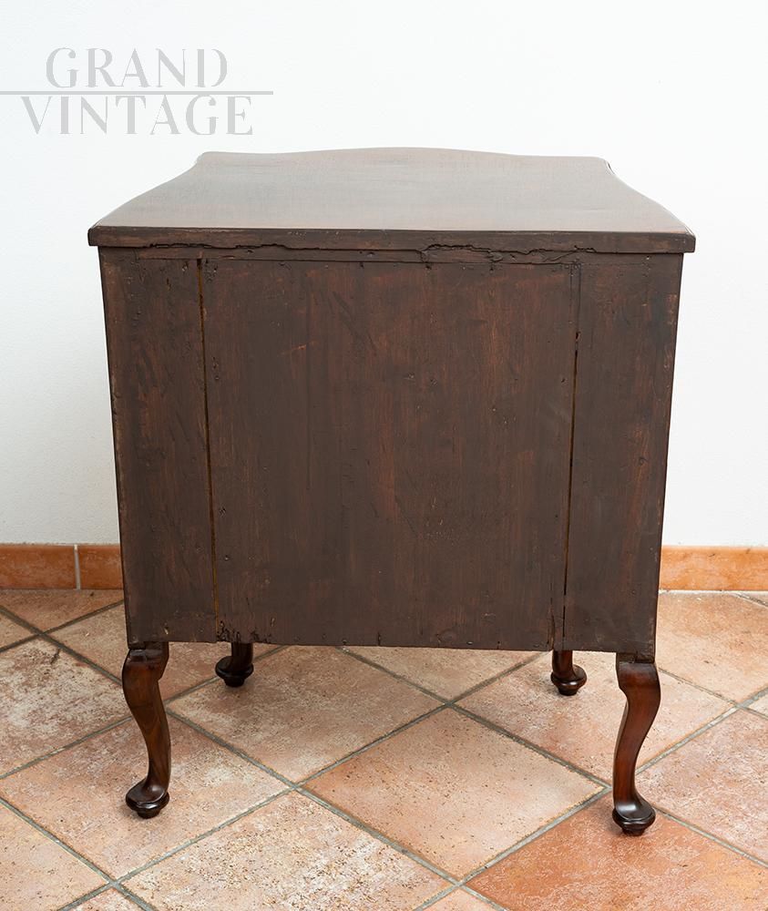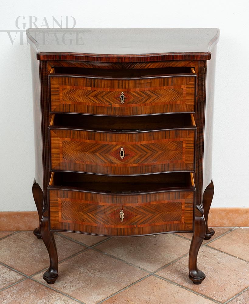 Comoncino piccolo comò antico cassettiera antica del '700 del periodo Luigi XIV Napoletano in radica di noce con innesti di intarsio in legno esotico pregiato. Il fronte è caratterizzato da tre cassetti bombati messi in risalto da una bella messa in opera del legno a spina di pesce inglobato all'interno di un profilo in legno rosa. I laterali riportano lo stesso impianto del fronte con al centro un rombo sempre in legni esotici pregiati. I due piedi a cabriolet sono collegati da una base mistiliea e poggiano a terra tramite una semisfera. Gli interni e la schiena sono in legno di pioppo tipico della tradizione ebanistica napoletana. Il comoncino è stato restaurato da maestri artigiani con metodo tradizionale gommalacca e alcool fatto a mano.