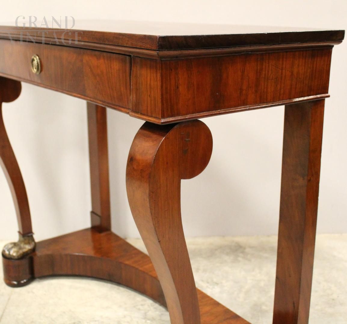 Console antica di epoca Carlo X in noce massello e lastronata in noce, della prima metà dell'800 di provenienza Italiana, restaurata.