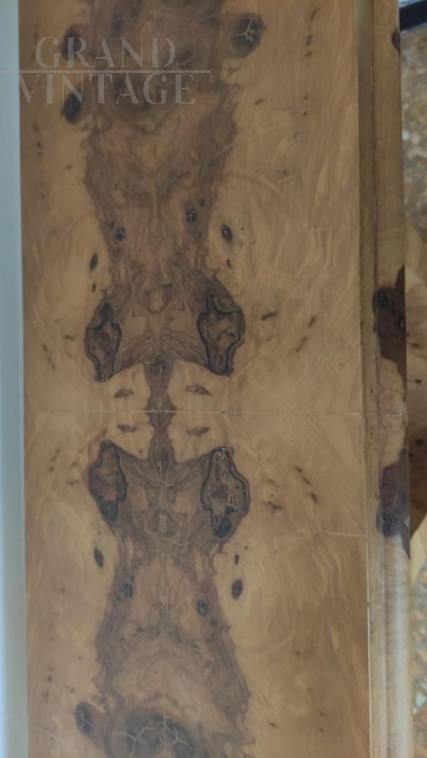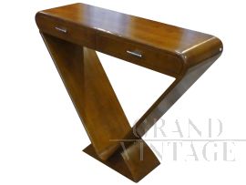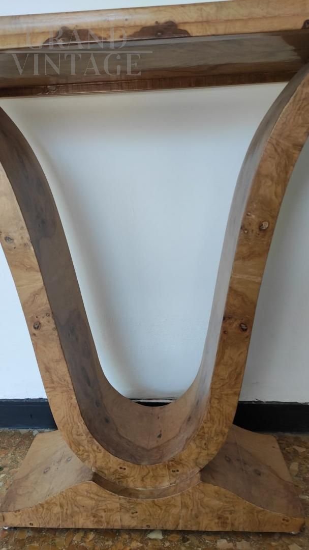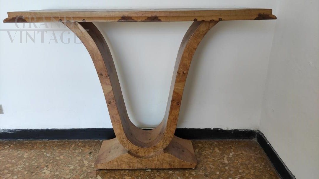 Bella console Art Déco anni '40 in radica di betulla, con base curva e piano rettangolare.