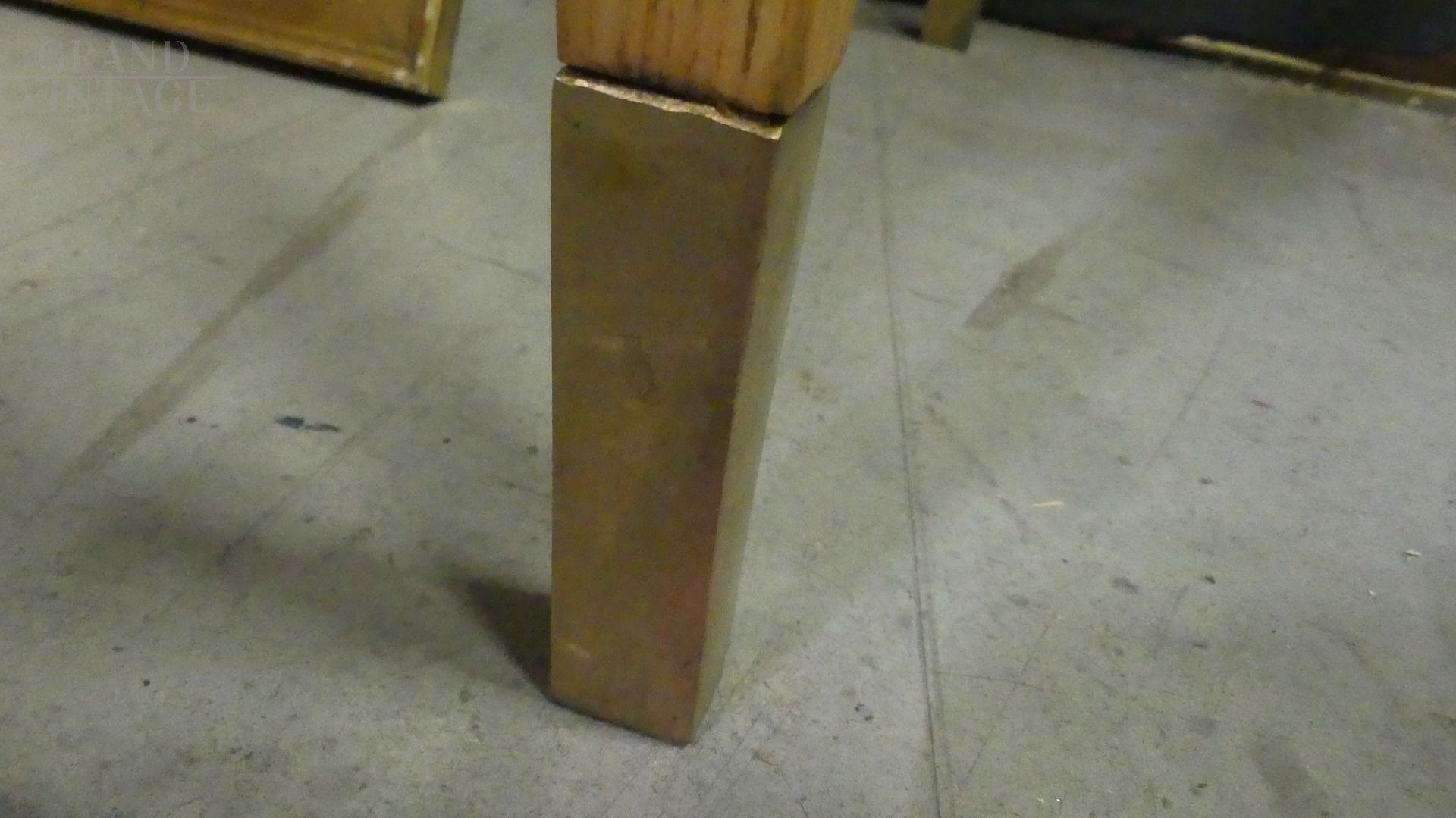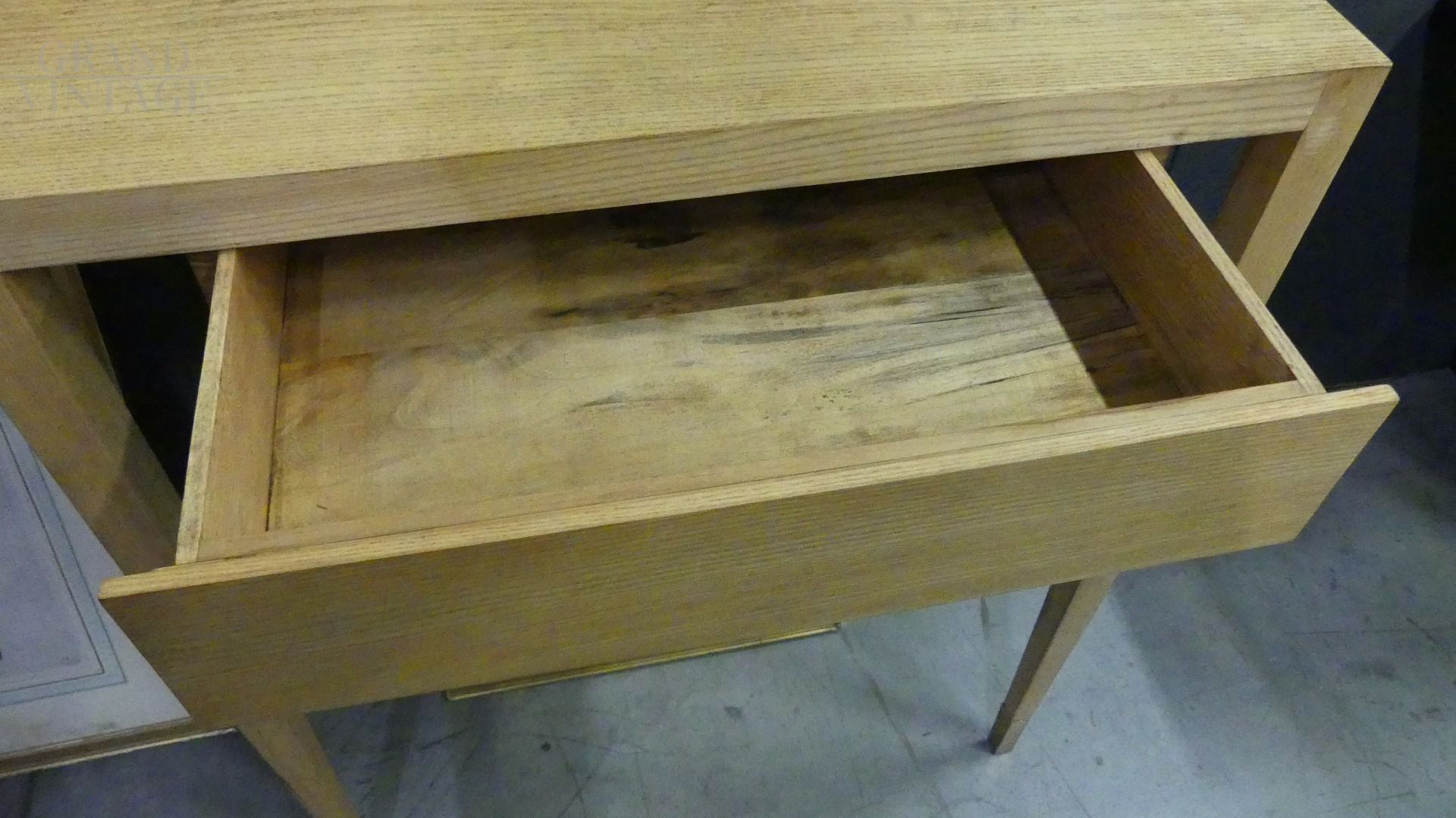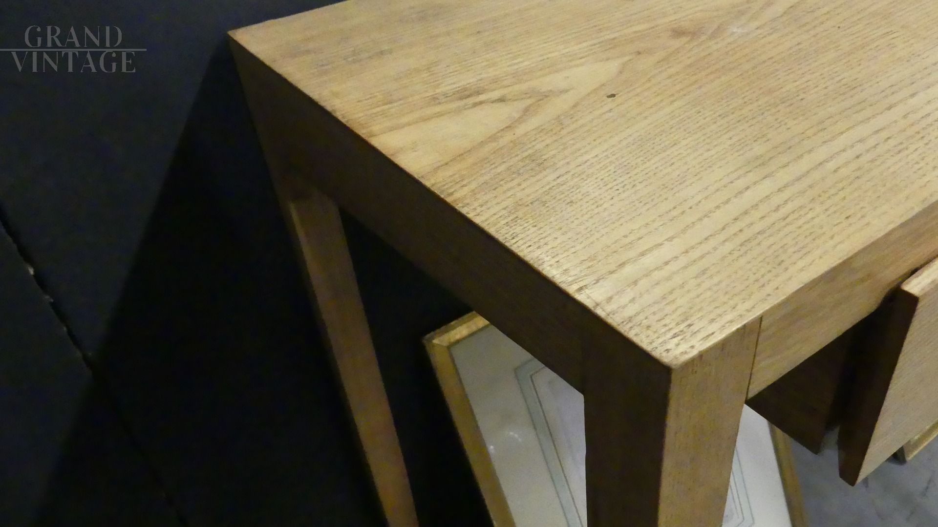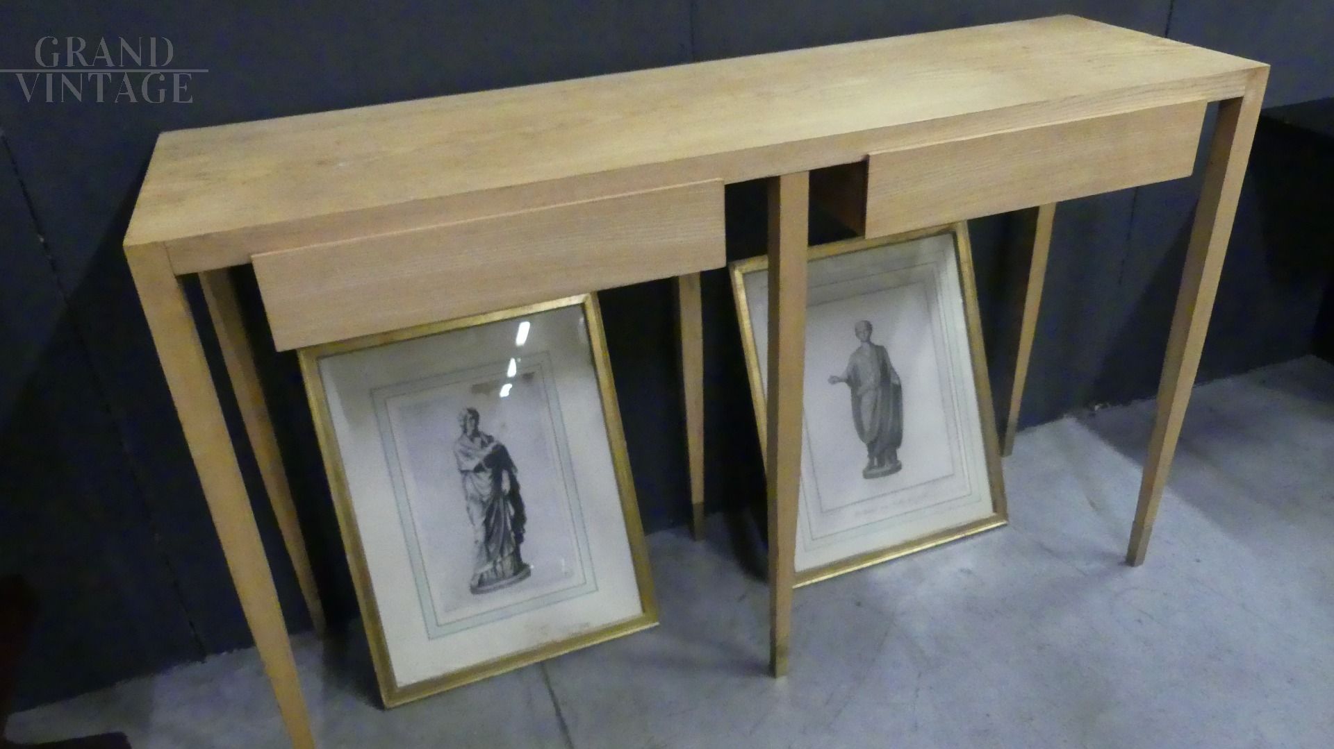 Console di manifattura italiana anni '70 attribuita a Gio Ponti, realizzata in legno di frassino, con sei gambe terminanti con piedini in ottone e due cassetti nella parte frontale.