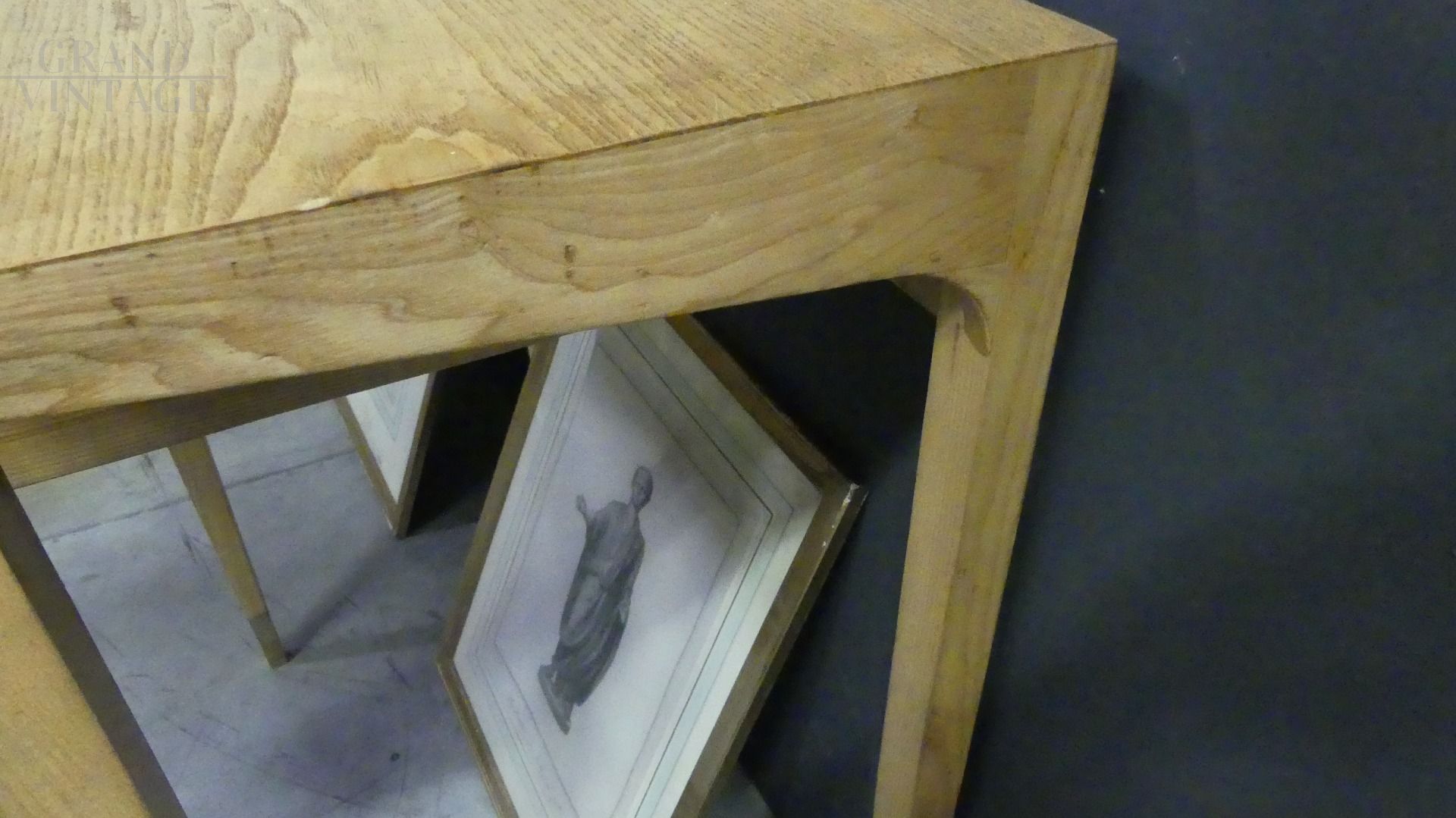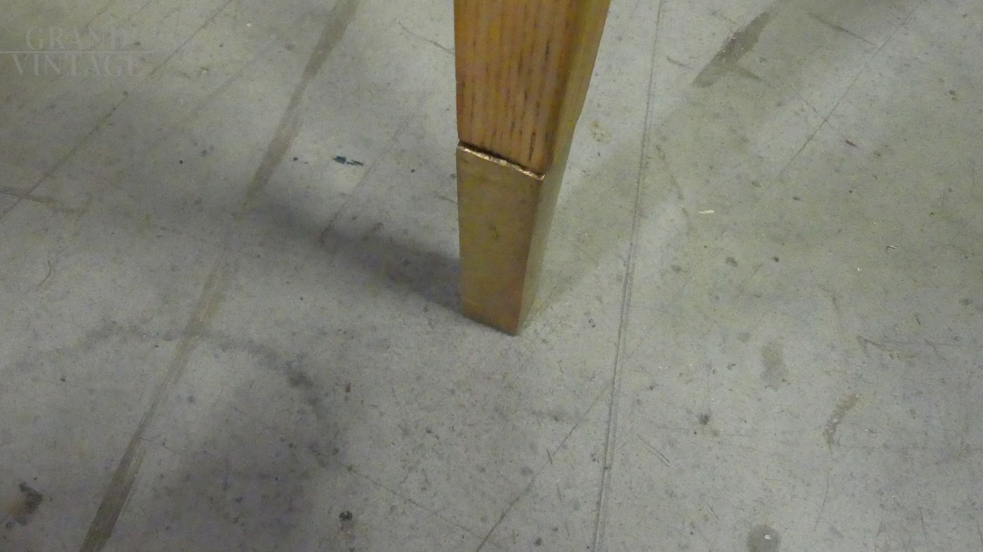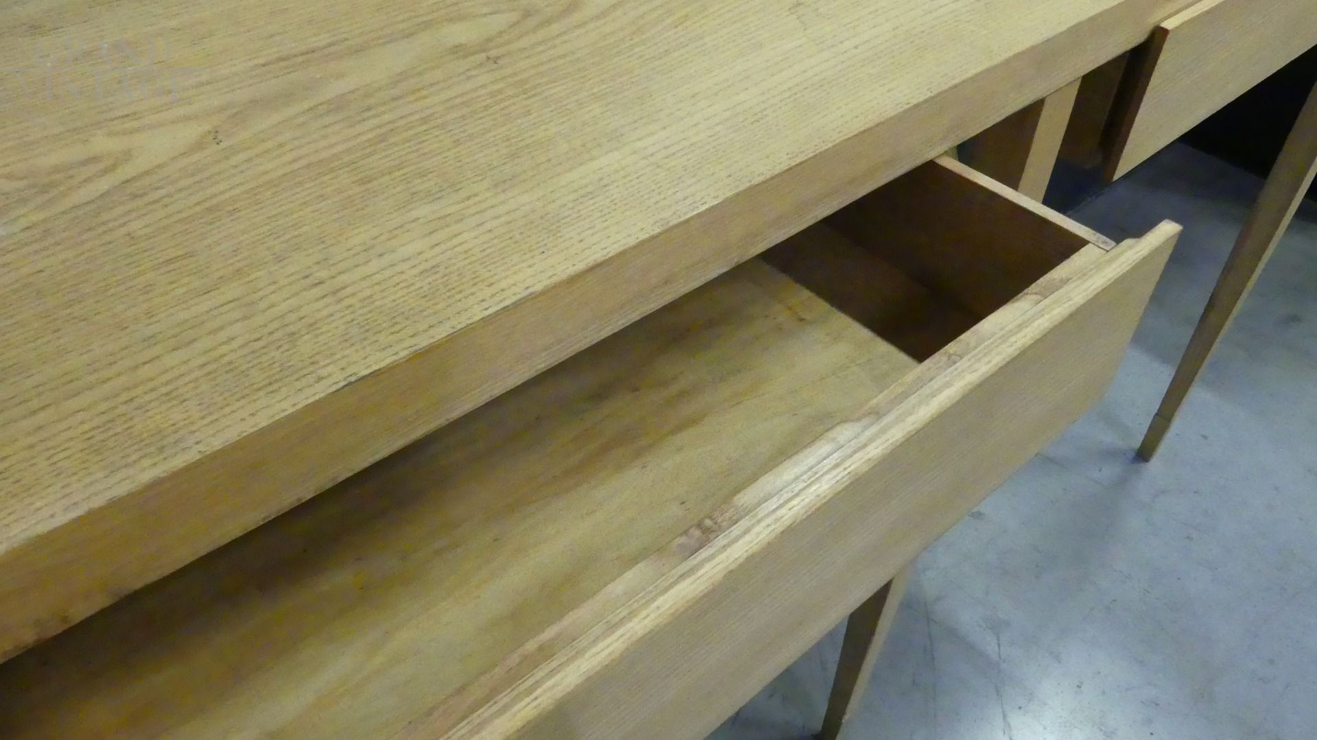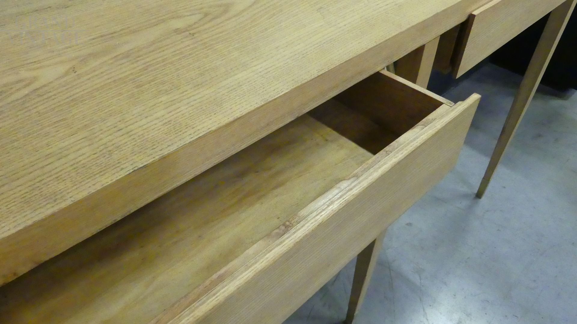 Console di manifattura italiana anni '70 attribuita a Gio Ponti, realizzata in legno di frassino, con sei gambe terminanti con piedini in ottone e due cassetti nella parte frontale.