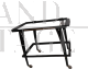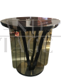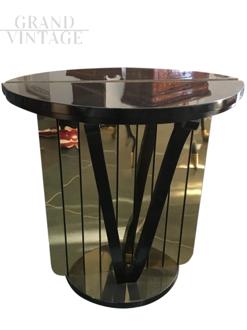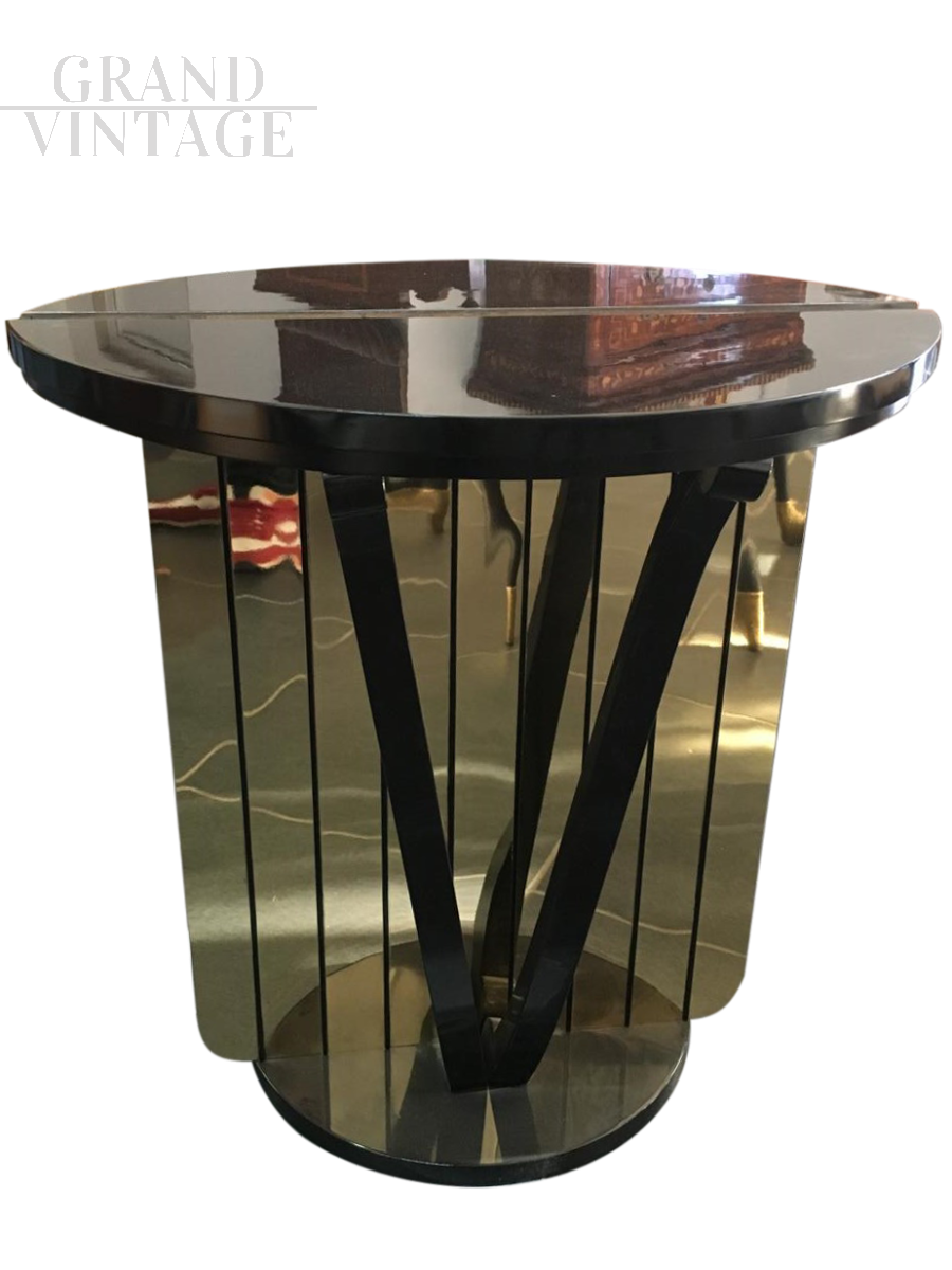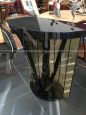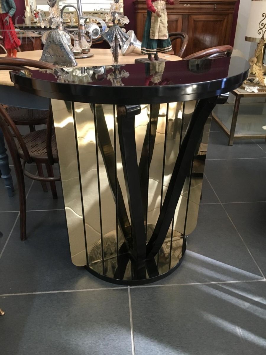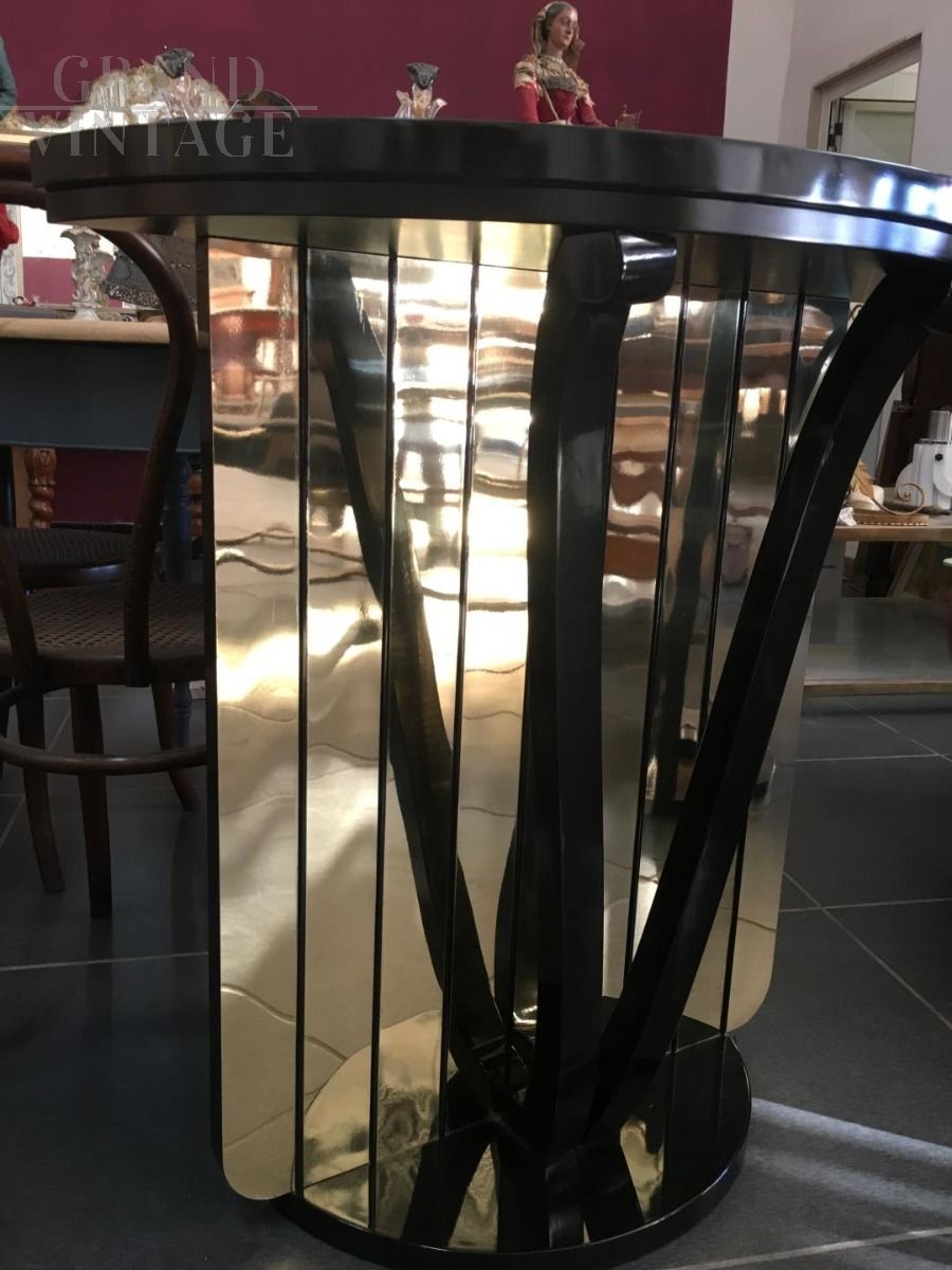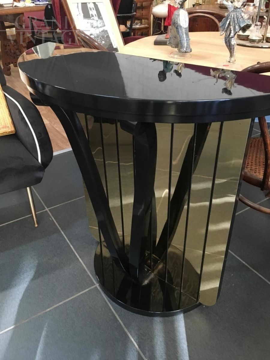 Consolle a mezza luna in legno laccato nero lucido e ottone.