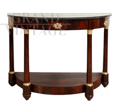 Consolle antica a mezzaluna Demi Lune Impero Francese in piuma di mogano con piano in marmo nero del Belgio. Il fronte è caratterizzato da tre colonne piumate con base e capitello in bronzo dorato finemente cesellato. La fascia sottopiano è caratterizzata da tre cassetti tra cui uno centrale più grande e due laterali esaltati da elementi in bronzo dorato a motivo floreale. La consolle è stata restaurata da maestri artigiani con metodo tradizionale gommalacca e alcool fatto a mano.