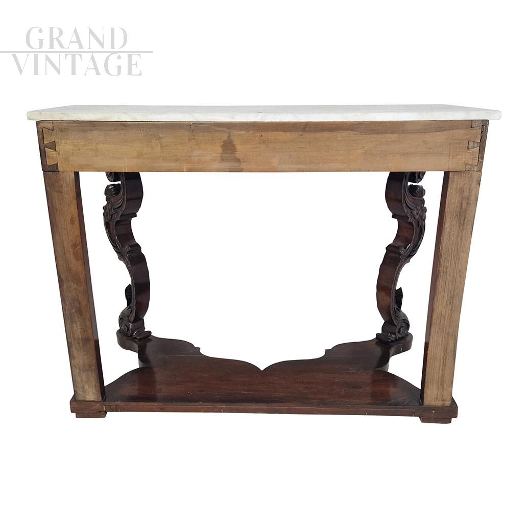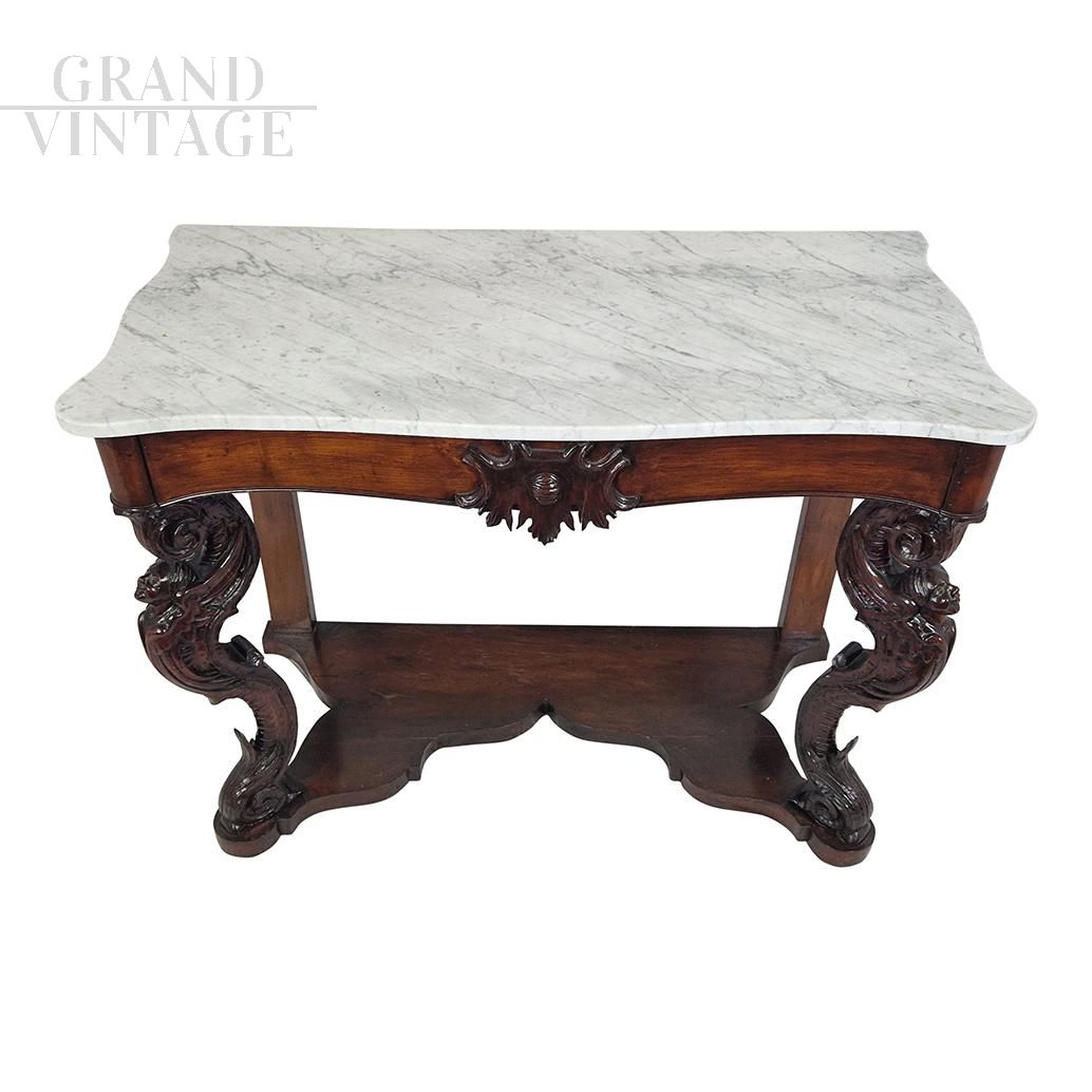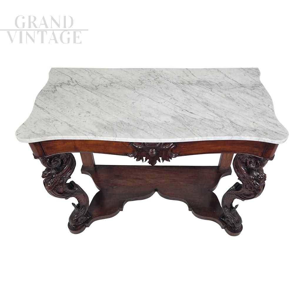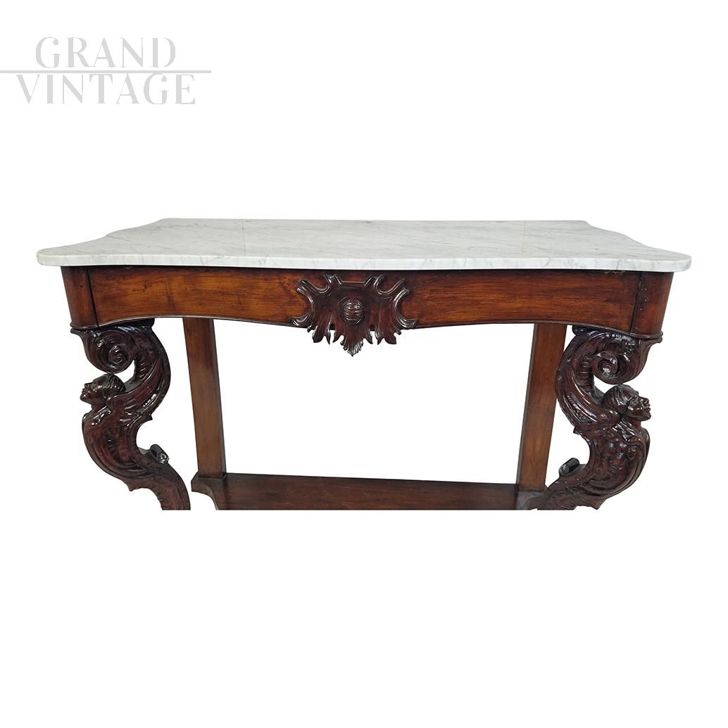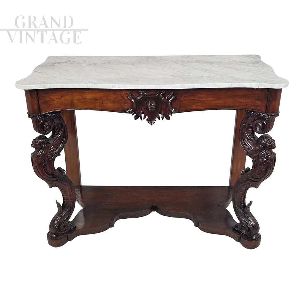 Console antica di epoca Luigi Filippo, Italia XIX secolo, in legno intagliato e decorato con motivo di volute, le gambe splendidamente mosse riportano delle sculture di cariatidi, il piano sagomato è in marmo bianco di Carrara.