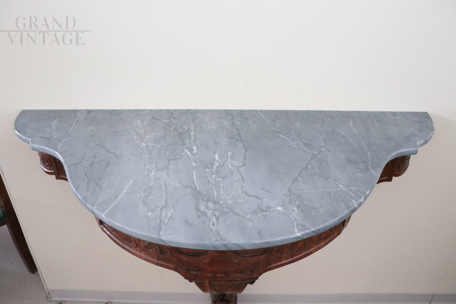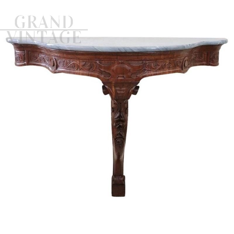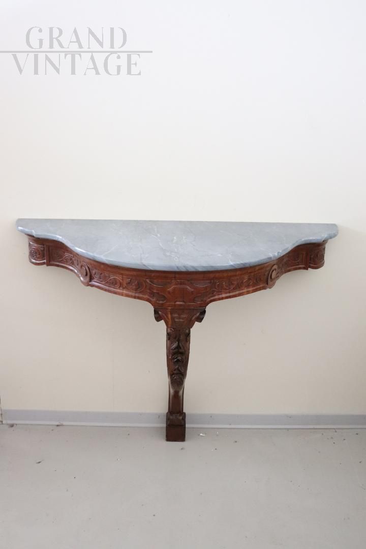 Consolle antica in mogano intagliato con piano in marmo, metà '800