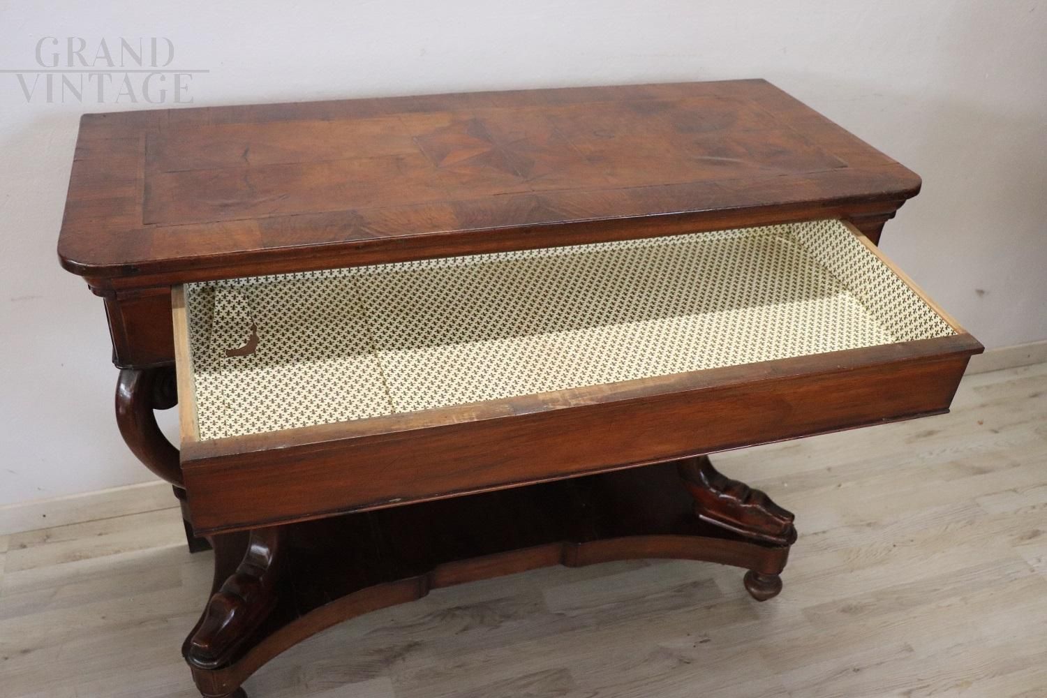 Raffinata ed elegante consolle antica della prima metà dell'Ottocento, piena epoca Carlo X, realizzata in pregiato legno di noce. Presenta raffinata decorazione intagliata nelle due gambe frontali mosse a forma di tritone, tipico elemento decorativo di questo periodo. Dotata di un pratico cassetto. Perfetta per arredare ingressi o saloni. Ottime condizioni, piccoli segni di usura a livello di finitura. Prezzo trattabile.