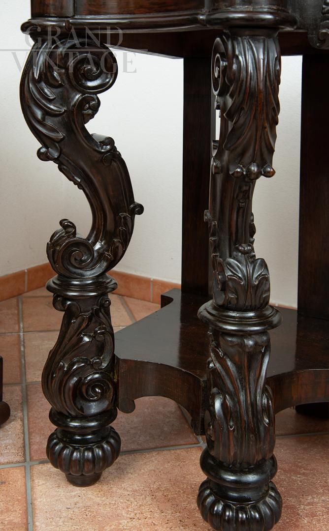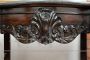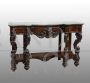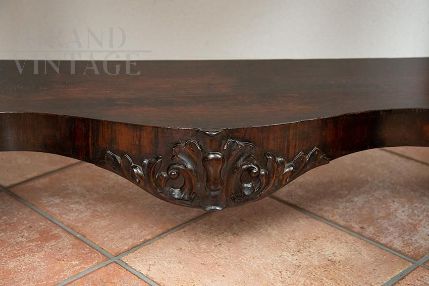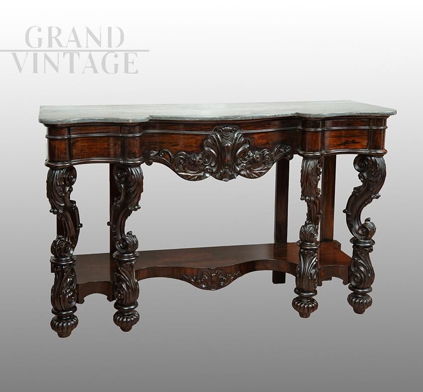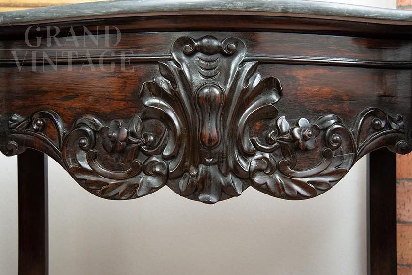 Consolle antica Luigi Filippo Napoletana in legno esotico pregiato con piano in marmo grigio bardiglio. Il piano è sostenuto da una fascia sottopiano mistilinea con al centro una grossa cimasa. Quattro grossi piedi aventi una forma a cabriolet caratterizzano il prospetto frontale e risultano essere intagliati finemente con elementi a motivo fogliaceo. La base si presenta di tipo mistilineo e segue lo stesso andamento della fascia superiore con al centro sempre una cimasa. Quattro bei piedi a cuscinetto hanno la duplice funzione di sostenere e slanciare verso l'alto la consolle.