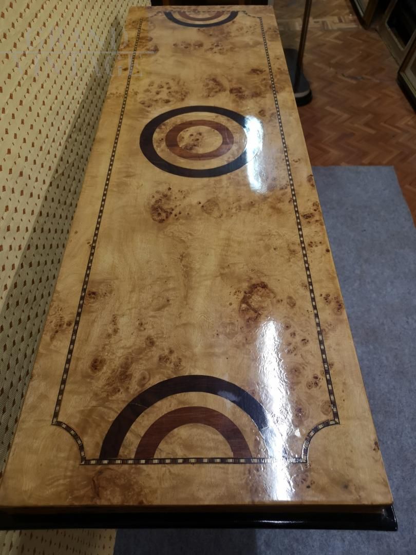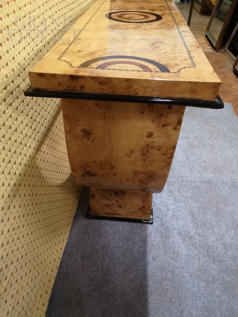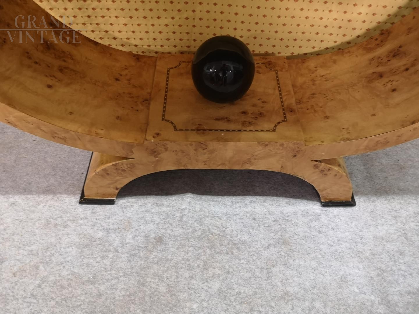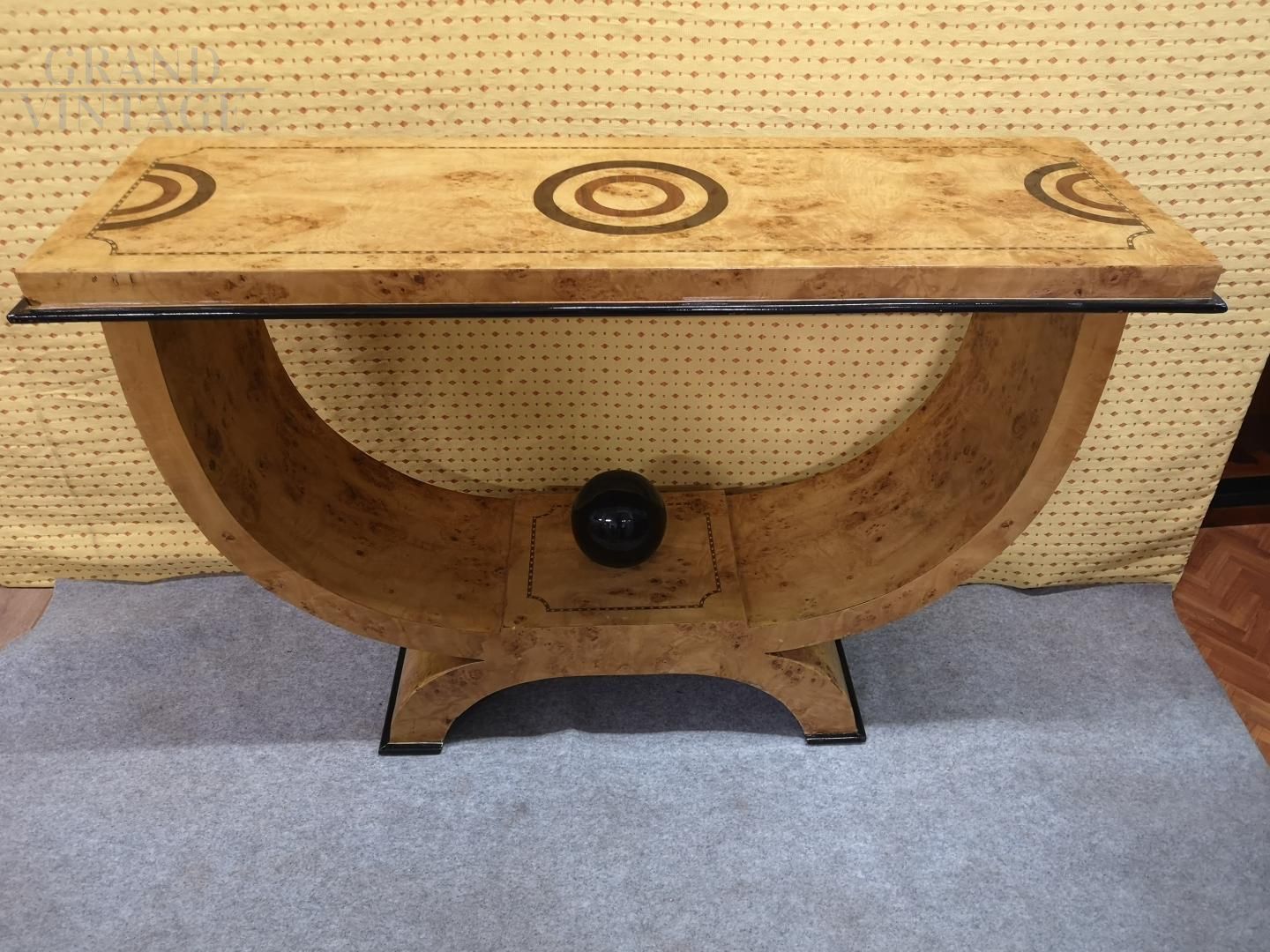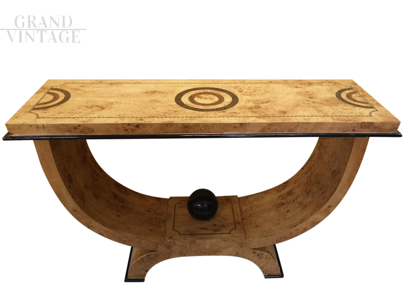 Consolle art déco in radica di betulla con sfera brandizzata nella parte bassa, piano intarsiato con motivi circolari utilizzando diversi tipi di legno.