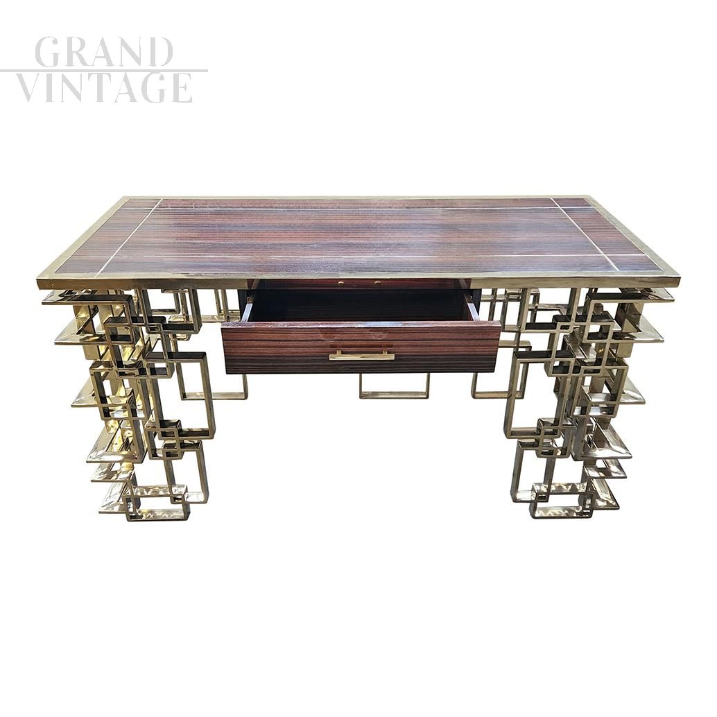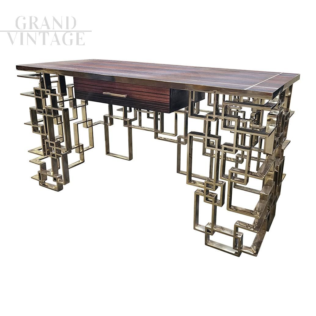 Consolle design bifacciale, interamente realizzata a mano, con base lavorata ad elementi geometrici in tubolare di sezione rettangolare e finitura superficiale cromo-oro, top in radica con eleganti inserti in ottone. Cassetto centrale in radica.
