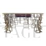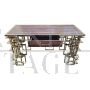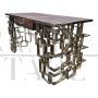 Consolle bifacciale in acciaio cromo-oro e top in radica
