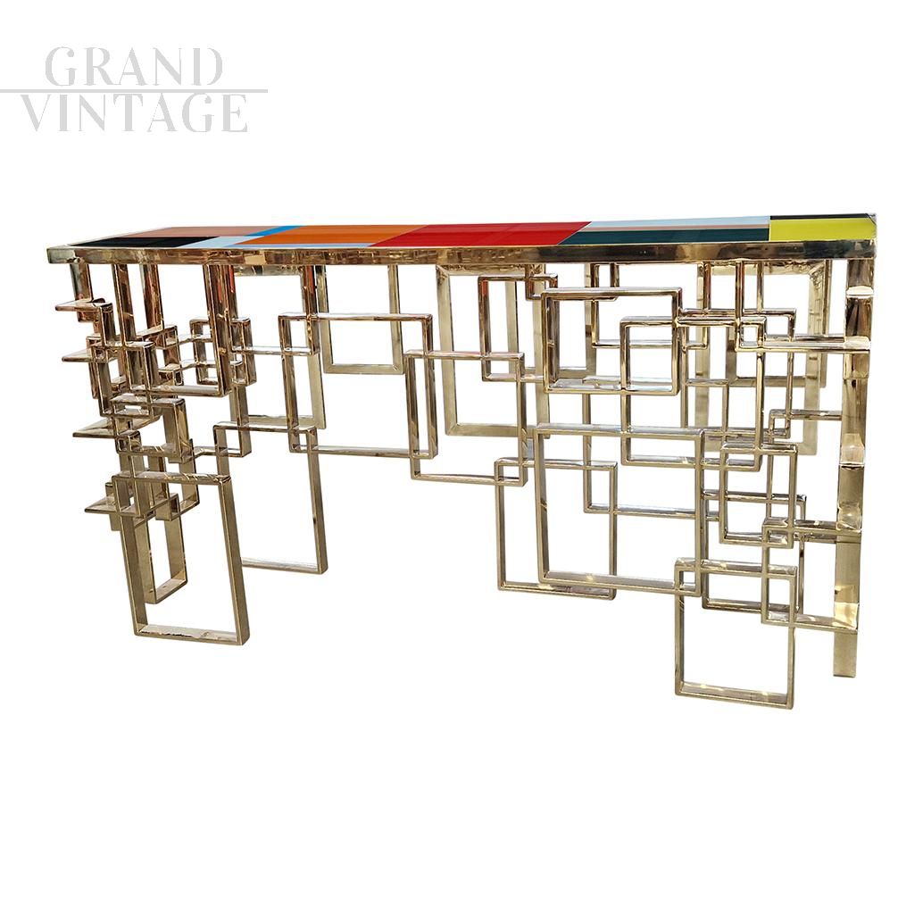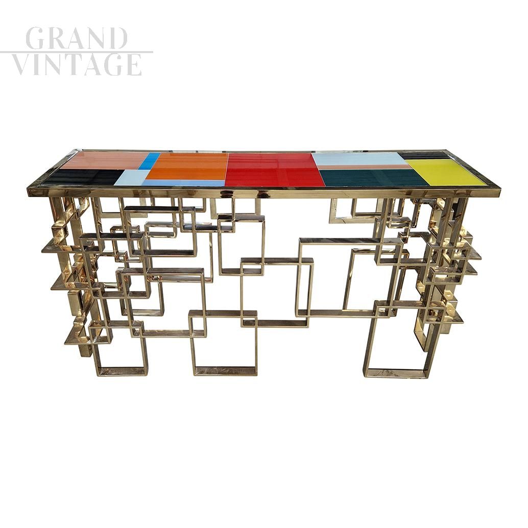 Consolle scultura design bifacciale, interamente realizzata a mano, con base lavorata ad elementi geometrici in tubolare di sezione rettangolare con finitura superficiale cromo-oro e top rivestito con elementi in vetro di Murano di diversi colori.