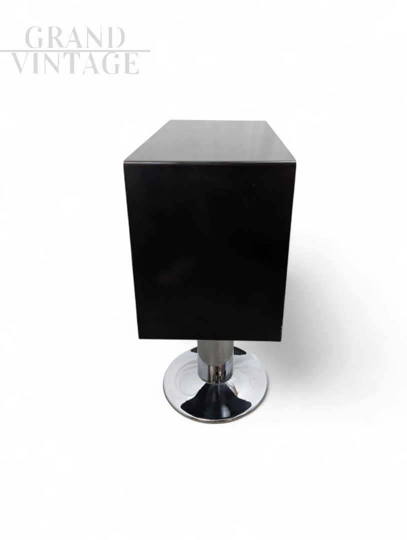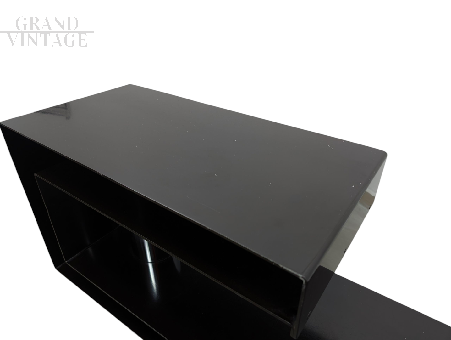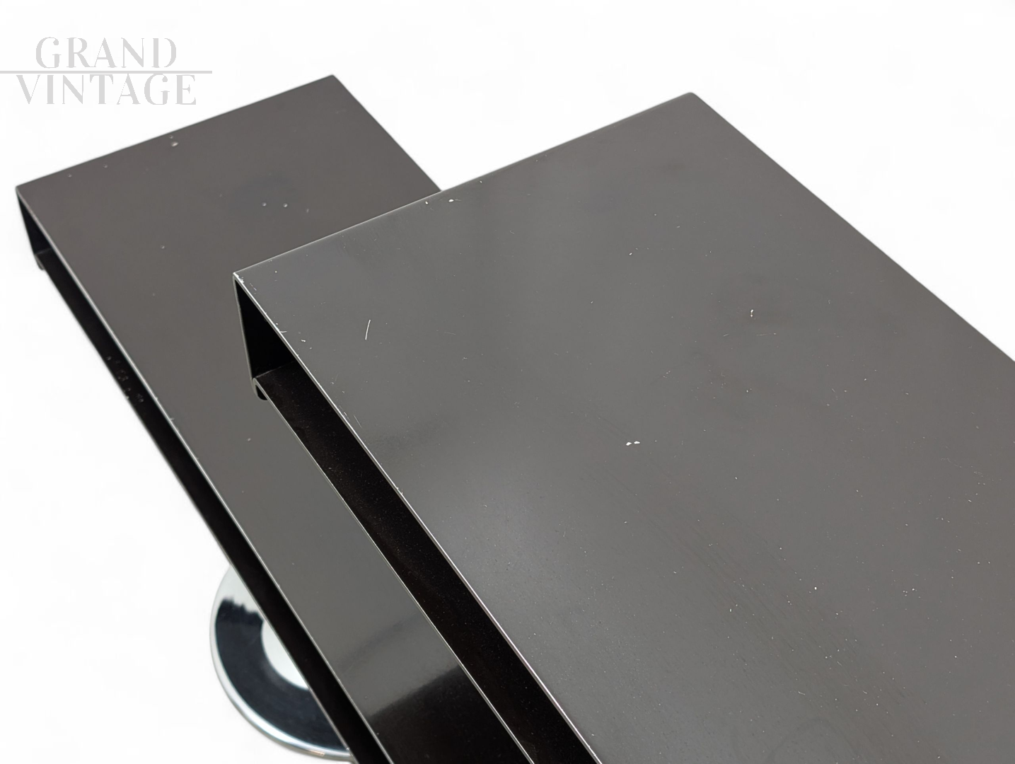 Scrivania o console da ingresso di modernariato dal design contemporaneo, realizzata interamente in metallo verniciato con finitura scura lucida, ad eccezione delle gambe cilindriche in metallo cromato lucido che conferiscono stabilità e un tocco elegante. La struttura presenta un’estetica geometrica, caratterizzata da linee decise e volumi a sbalzo che creano un effetto visivo dinamico e moderno. Condizioni: In buone condizioni generali. Sono presenti leggeri segni e graffi superficiali sulla verniciatura, visibili soprattutto in controluce (vedi foto). Una scrivania ideale per ambienti moderni, studi professionali o spazi di lavoro dallo stile industriale e ricercato.