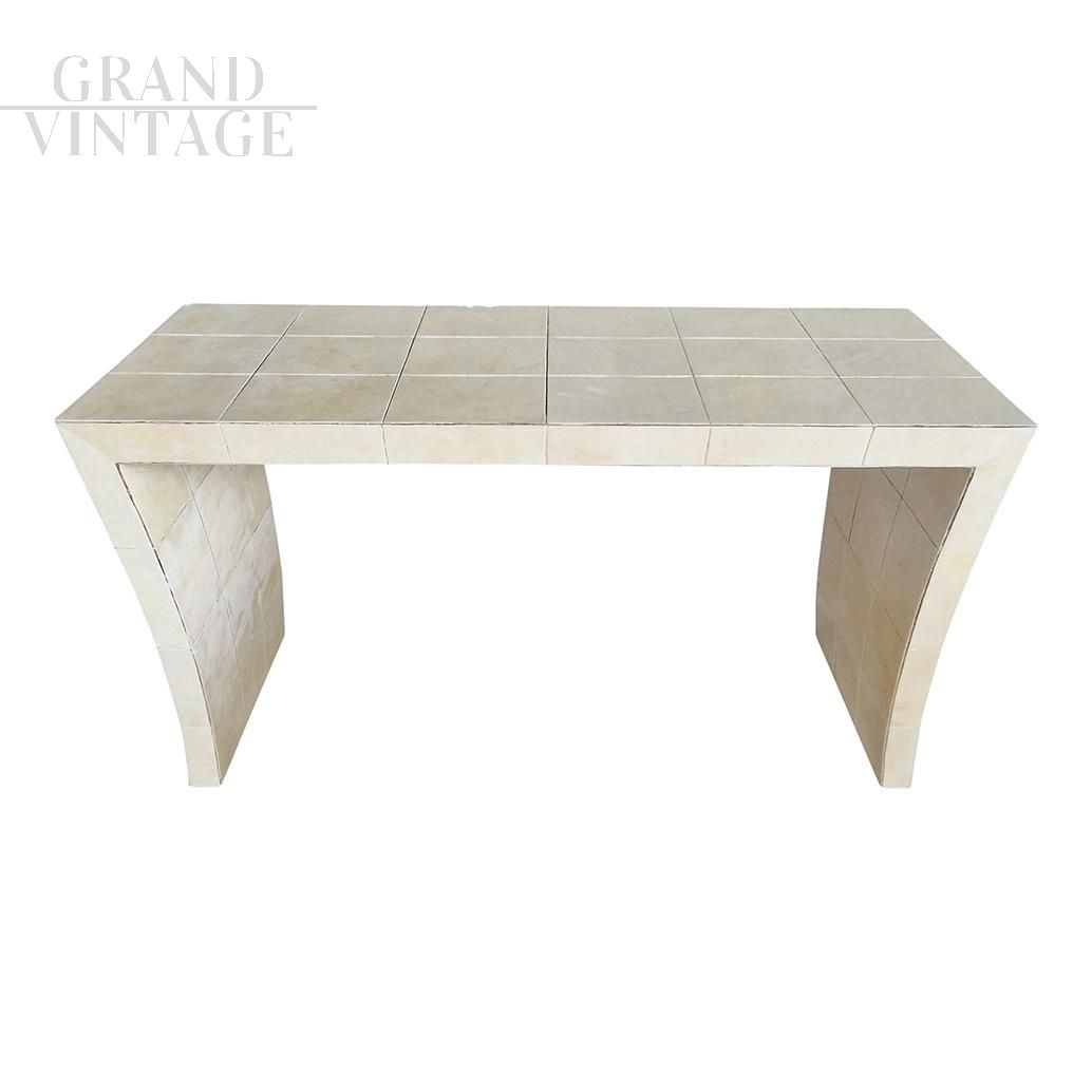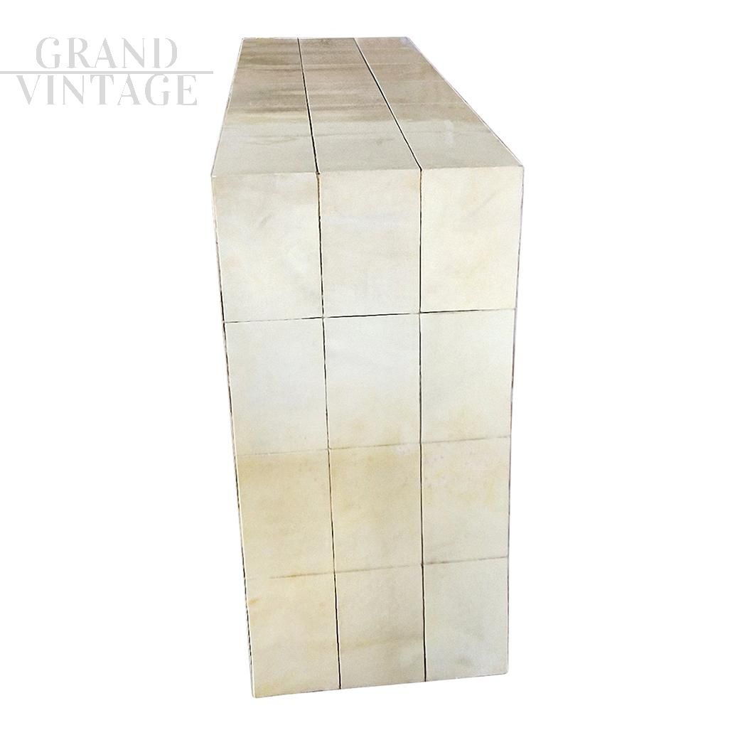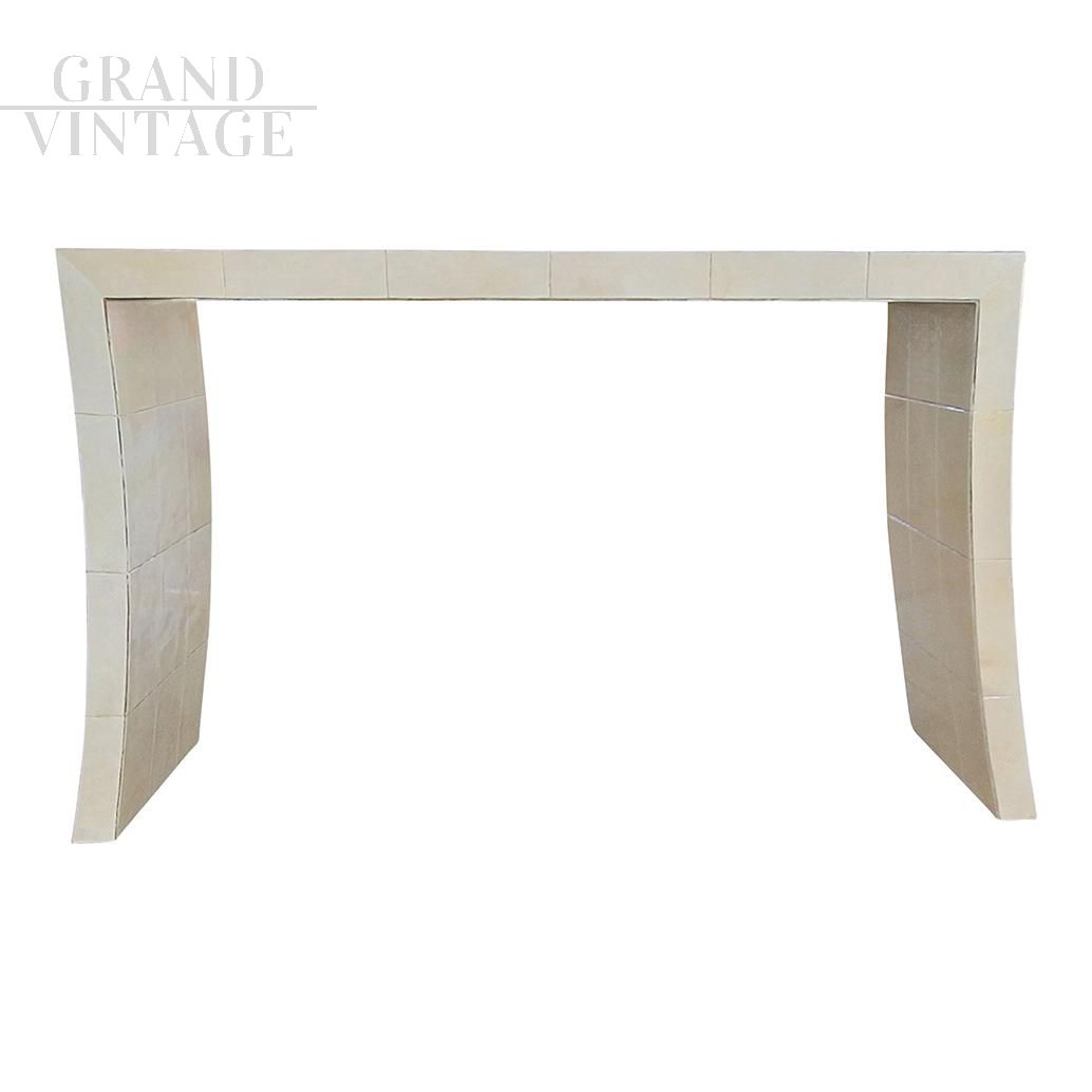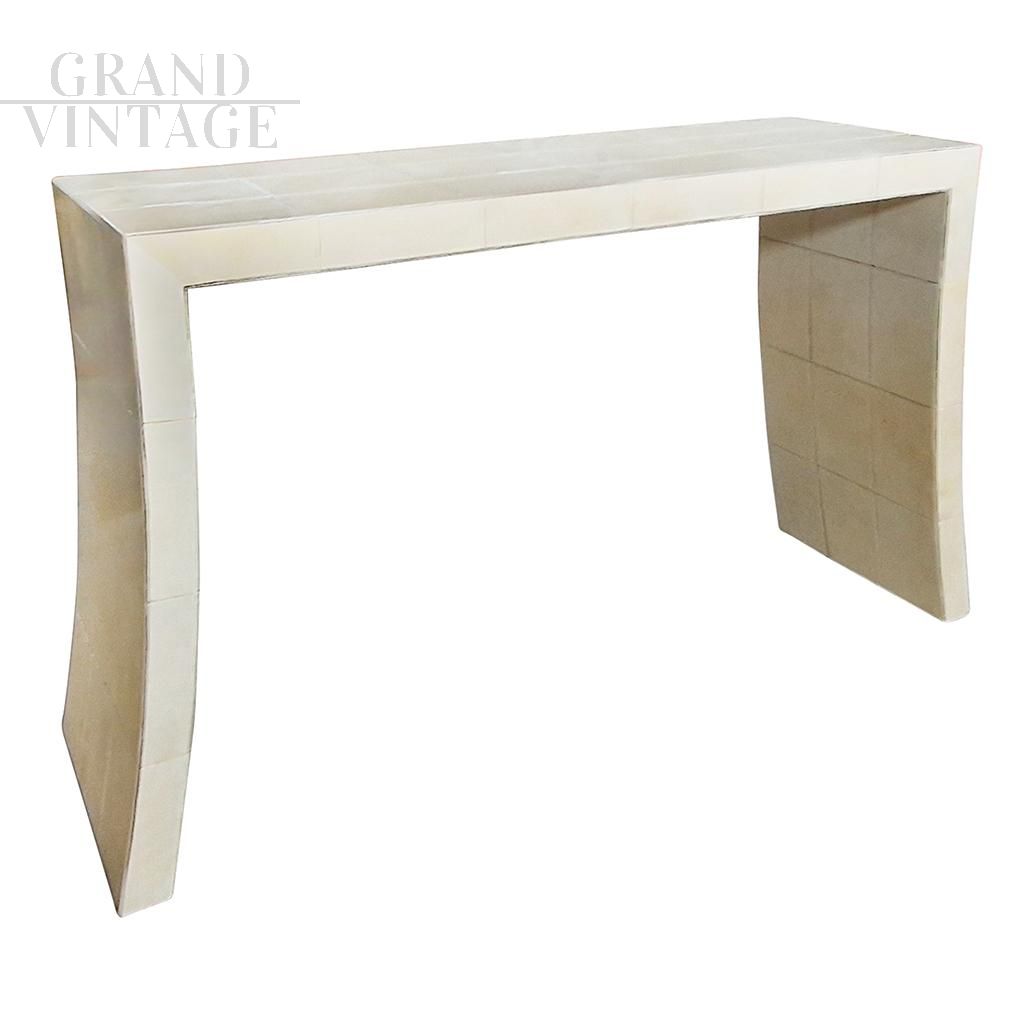 Consolle bifacciale in stile art déco in legno ricoperta in pergamena naturale color avorio con una particolare lavorazione a reticolo e bei fianchi svasati.