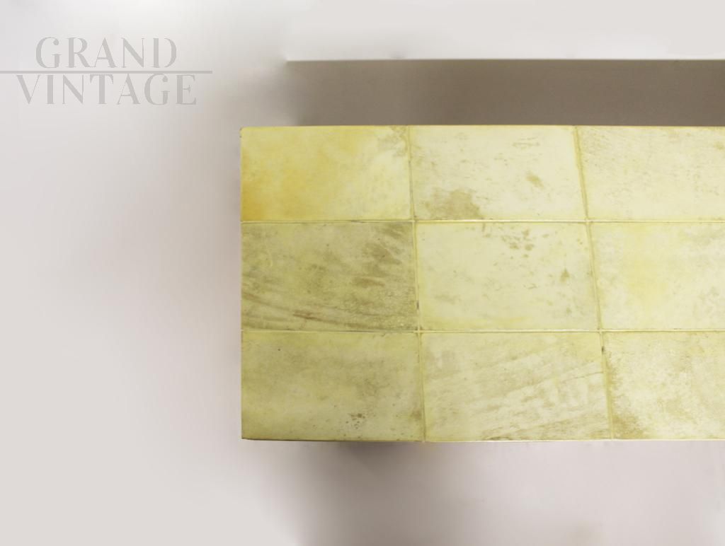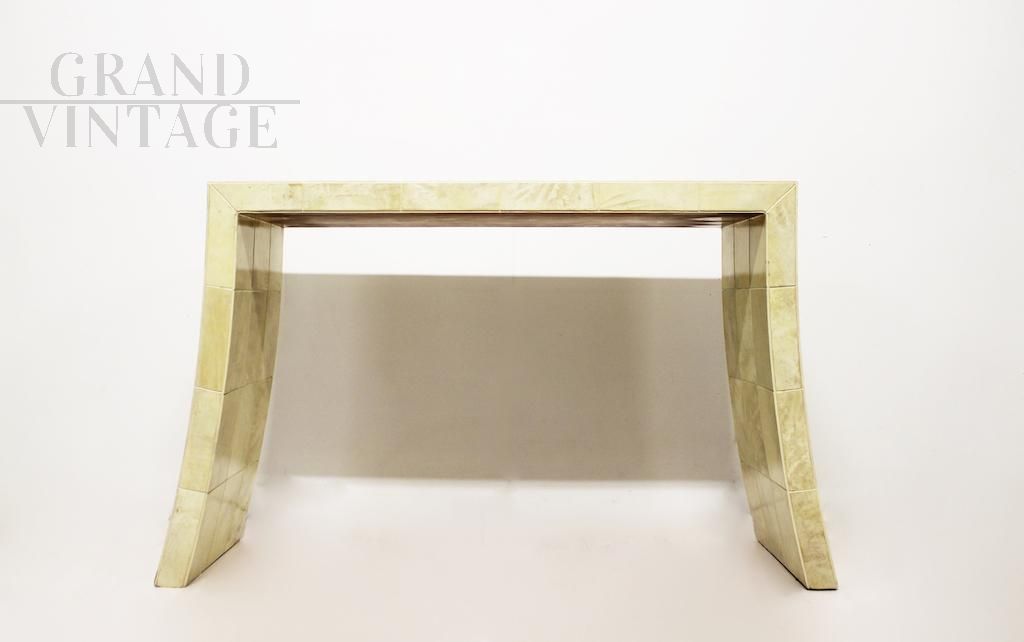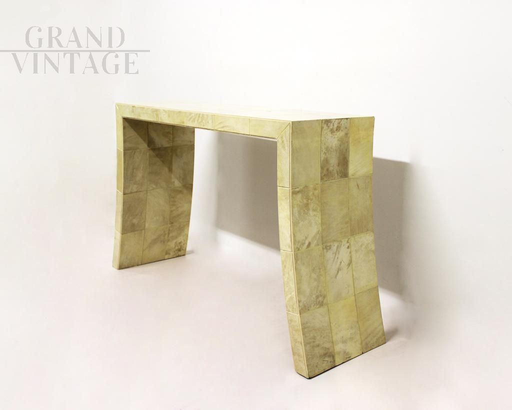 Particolare console in stile Art Déco in legno rivestito in pergamena con lavorazione a toppa, da notare la bellissima forma svasata delle gambe. La console è in stile, realizzata in Italia negli anni '80.