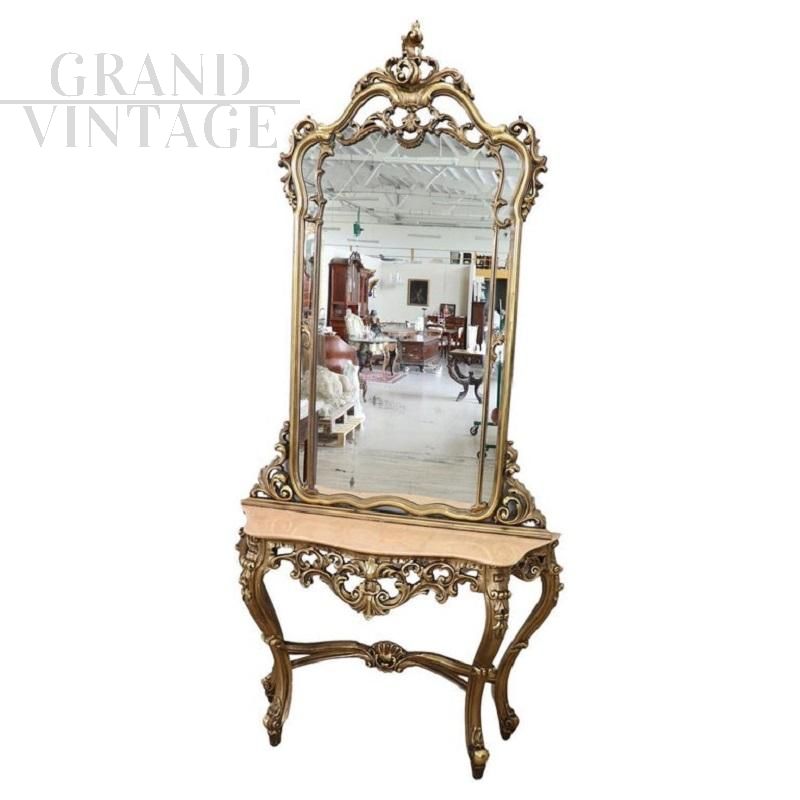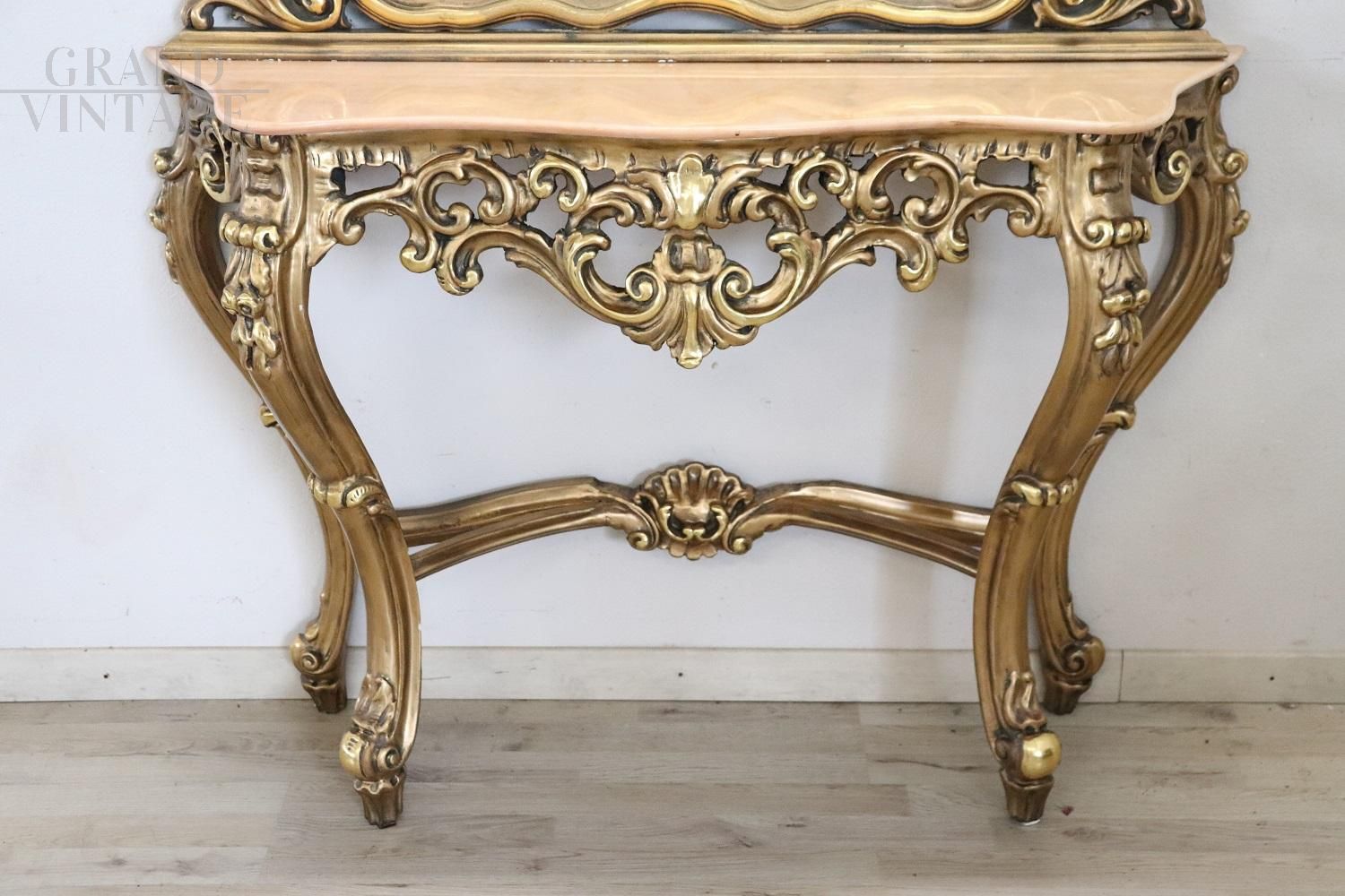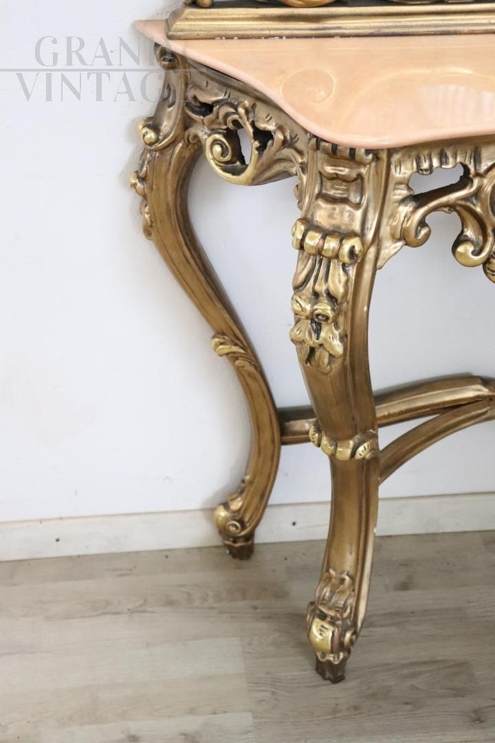 Consolle in stile antico barocco italiano con specchio dei primi decenni del Novecento, realizzata in legno massello intagliato e dorato con numerosi riccioli e volute. Il legno è completamente dorato e aumenta l'importanza di questa consolle. Perfetta per essere collocata in ingressi o saloni, legno e doratura in perfette condizioni. Grande specchio antico al mercurio con alcuni naturali difetti, visibili in foto. Il piano è in raffinato marmo rosa. Ottimo prezzo trattabile.