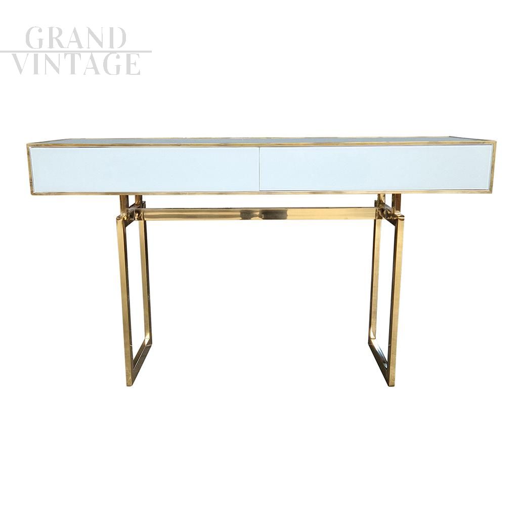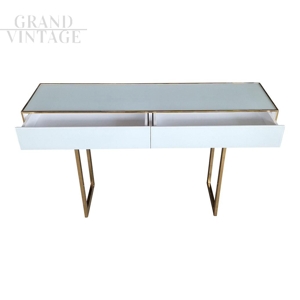 Consolle in vetro bianco e ottone con due cassetti