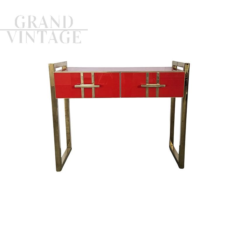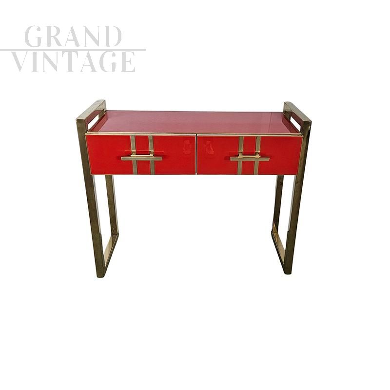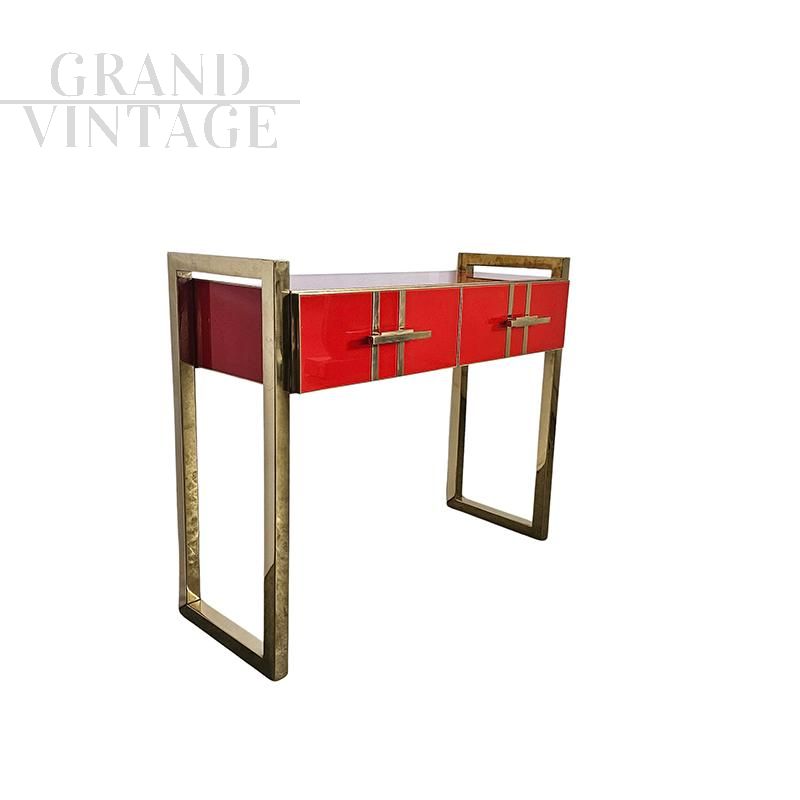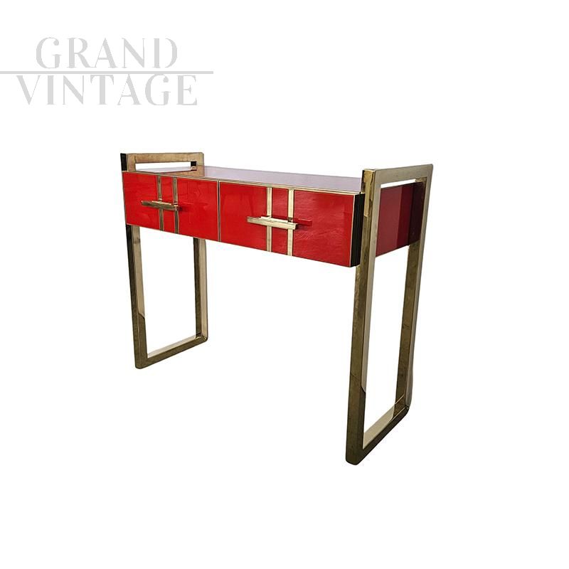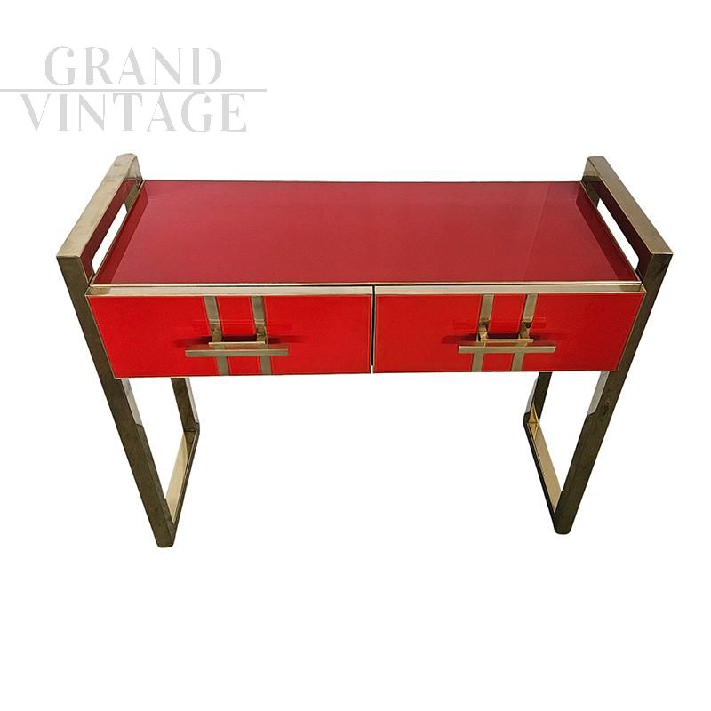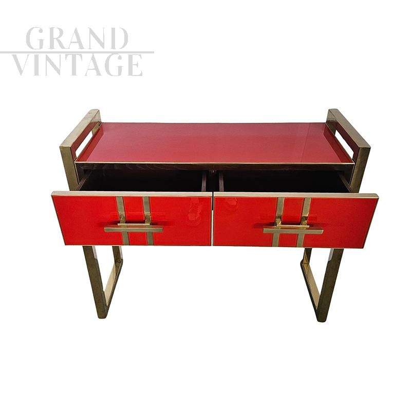 Consolle in legno, rivestita in vetro color rosso, arricchita da una struttura in tubolare di ottone. Profili, maniglie, gambe in ottone.