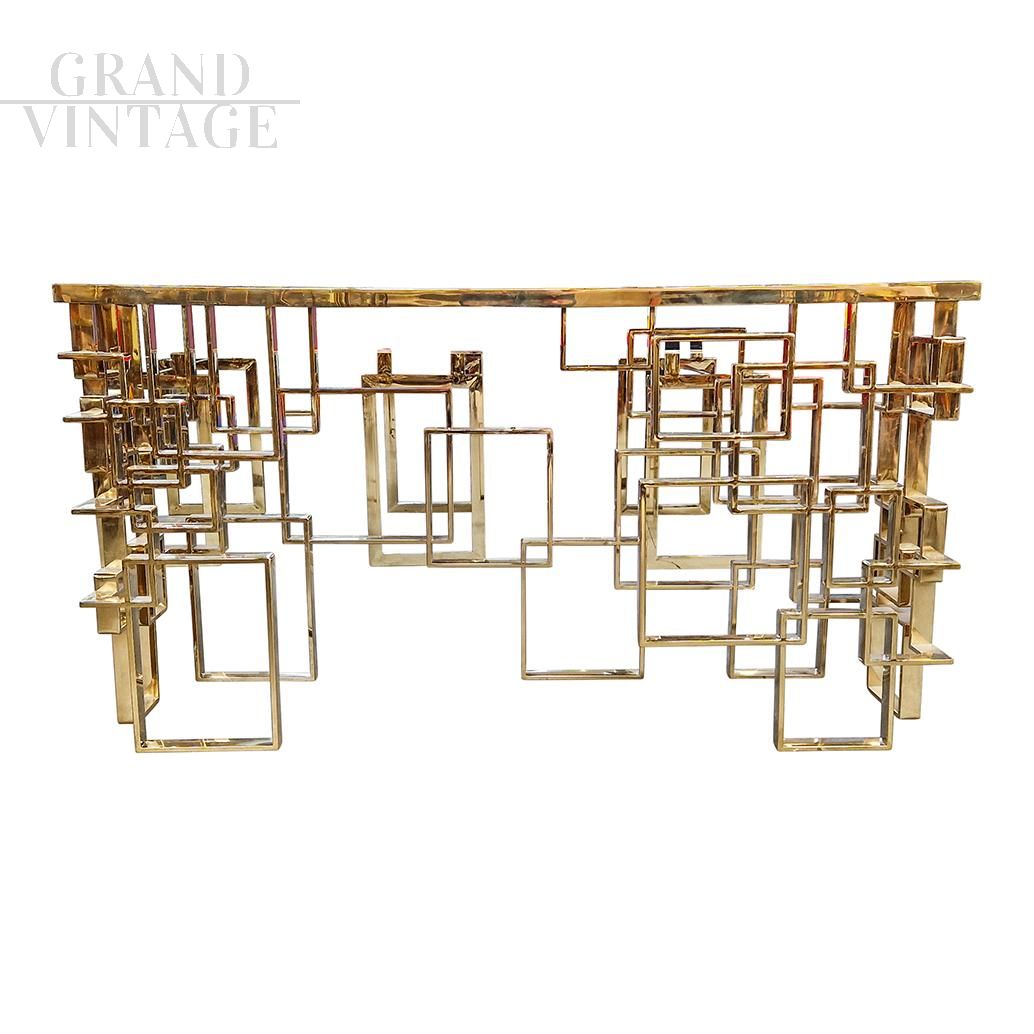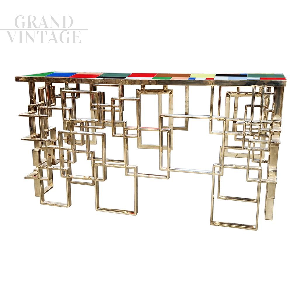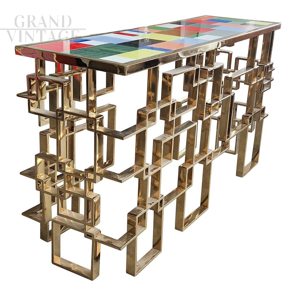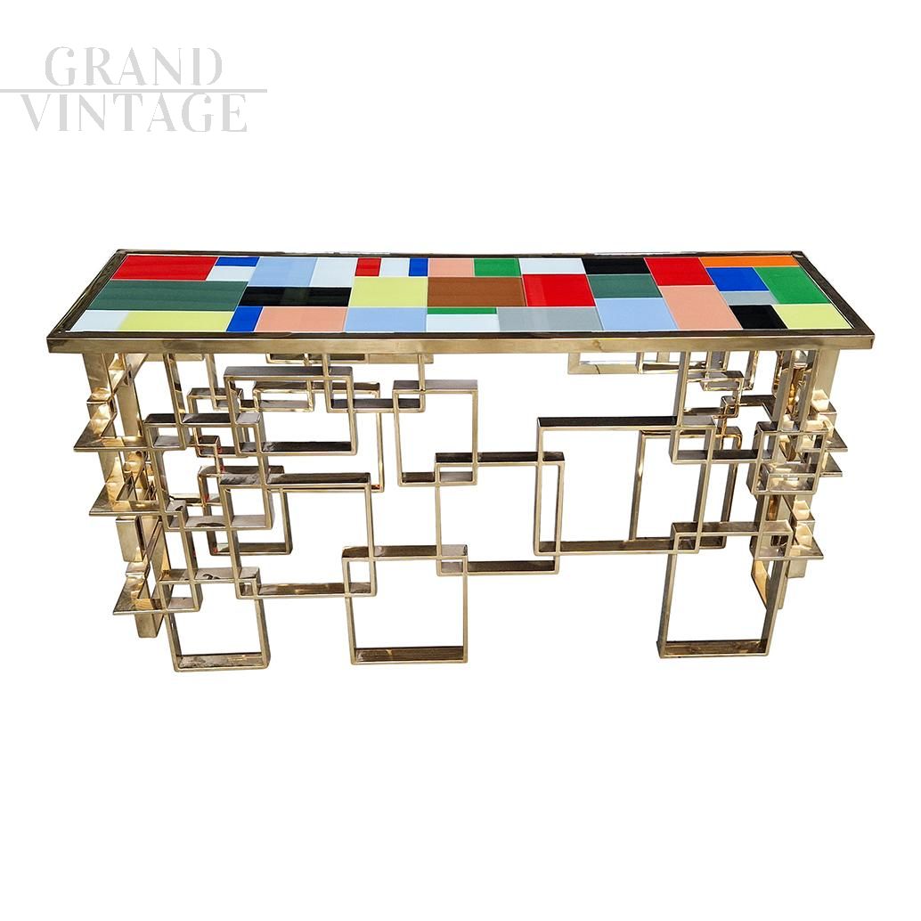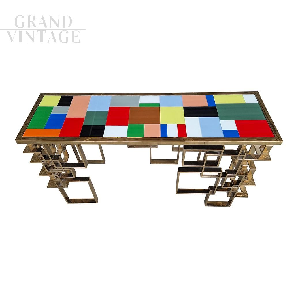 Consolle scultura design bifacciale, interamente realizzata a mano, con base lavorata ad elementi geometrici in tubolare di sezione rettangolare con finitura superficiale cromo-oro e top rivestito con elementi in vetro di Murano di diversi colori.