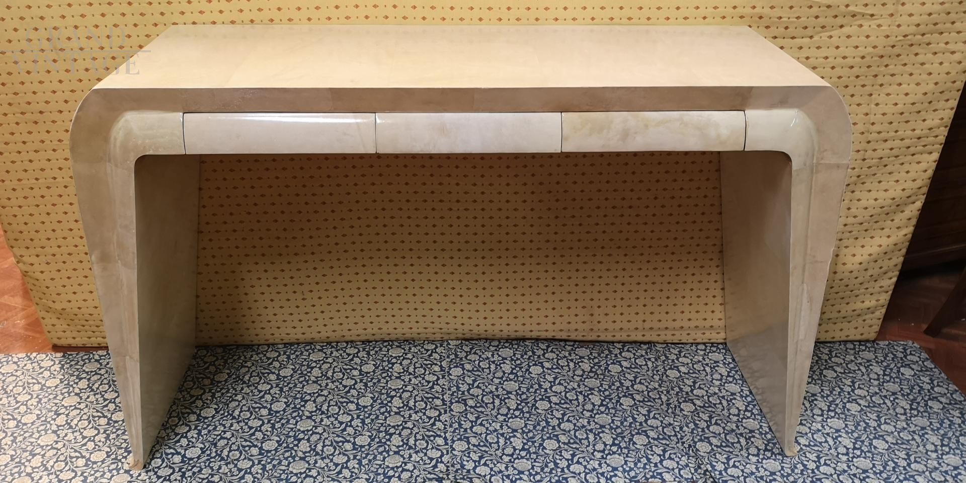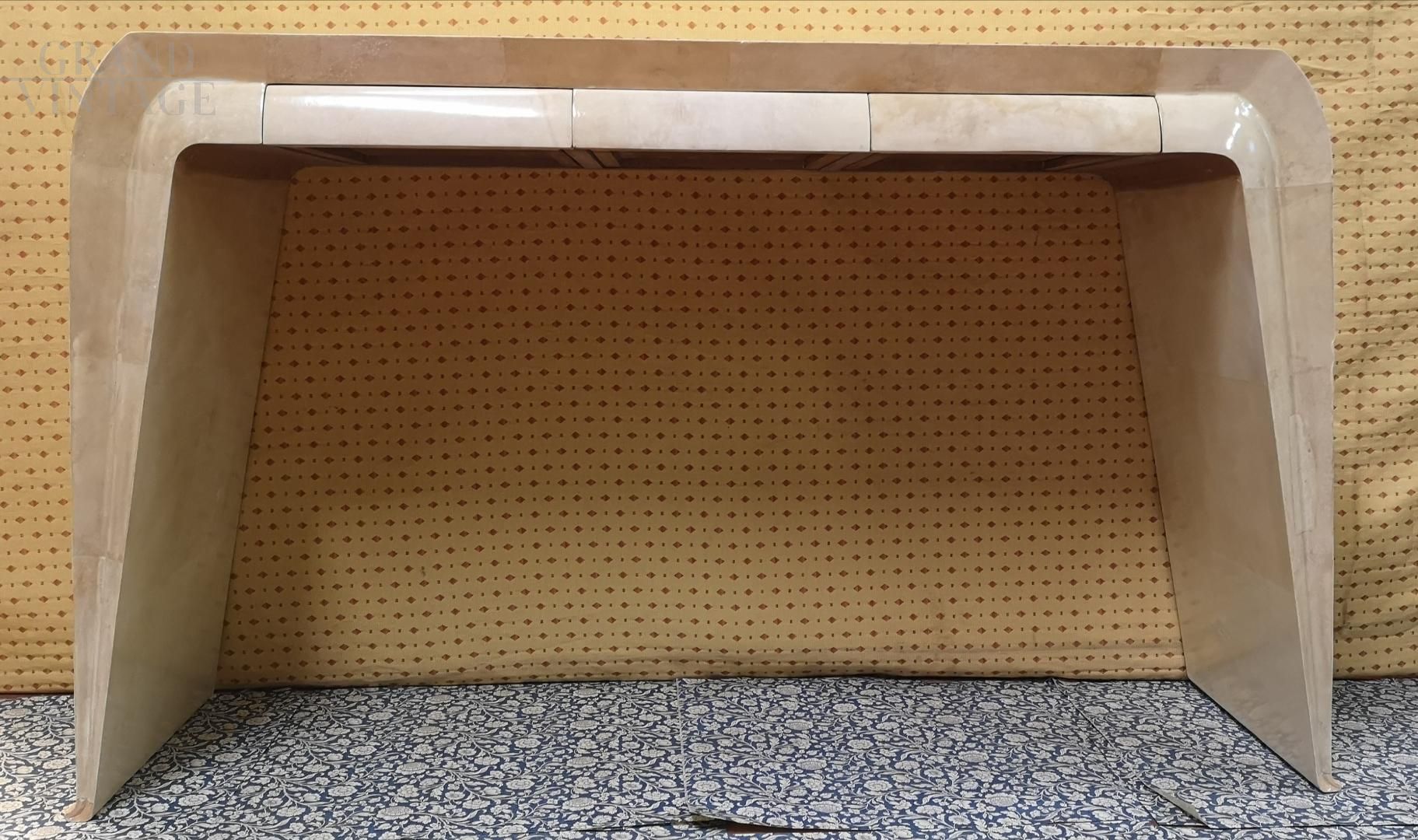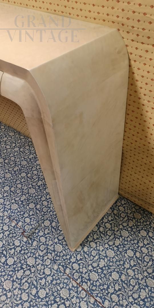 Consolle vintage francese in pergamena color avorio, dotata di 3 cassetti, linea molto sobria ed elegante.