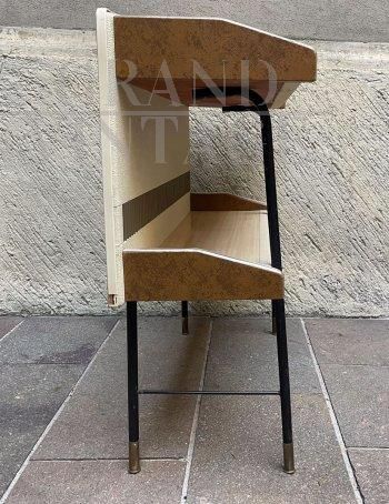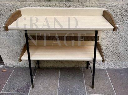 Particolare consolle vintage con due ripiani in legno in tonalità naturale e bianca, i montanti sono in metallo laccato nero. Modernariato italiano anni '60.